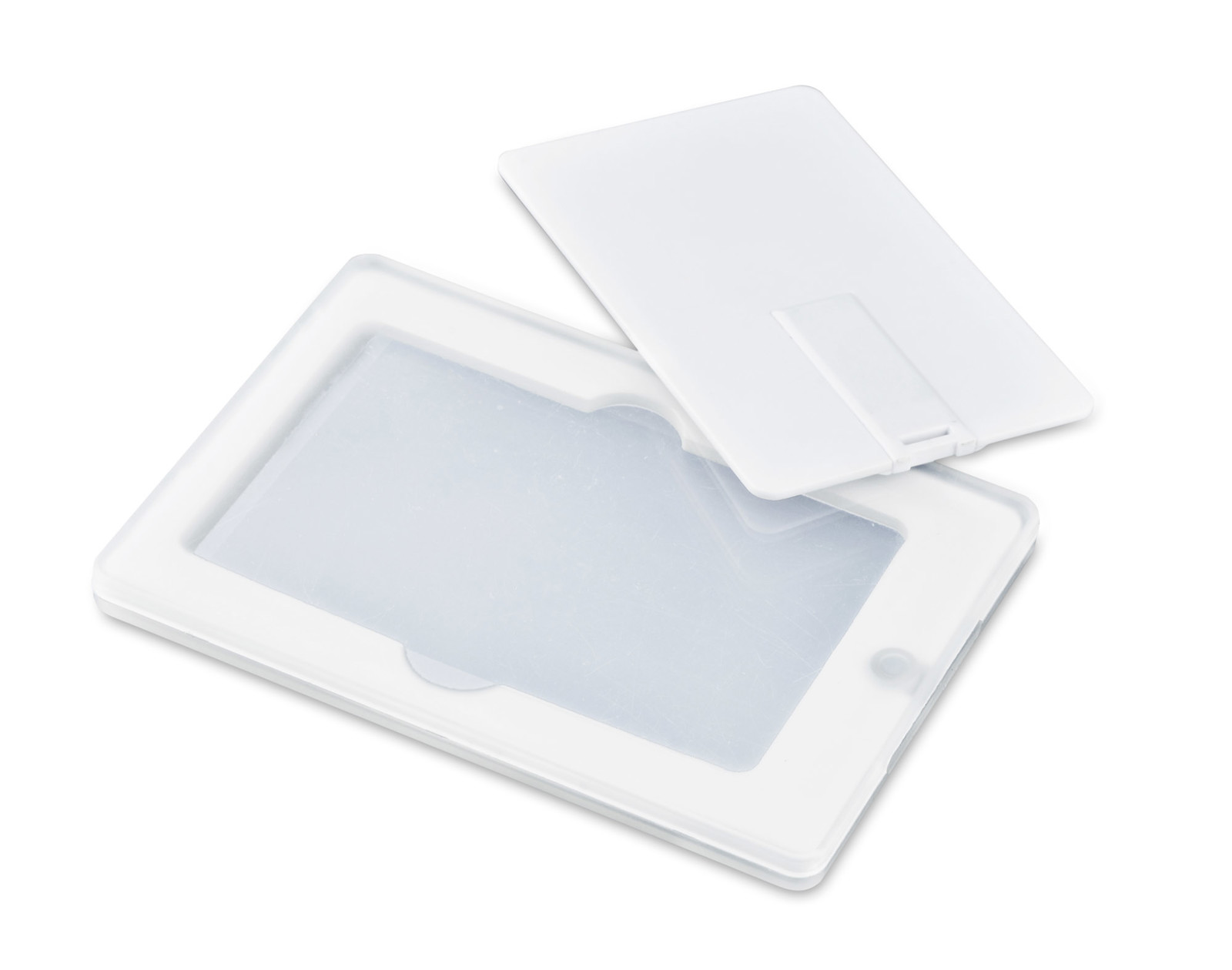 Plastic box for USB „Credit card”. Logo can be pad printed on the surface.