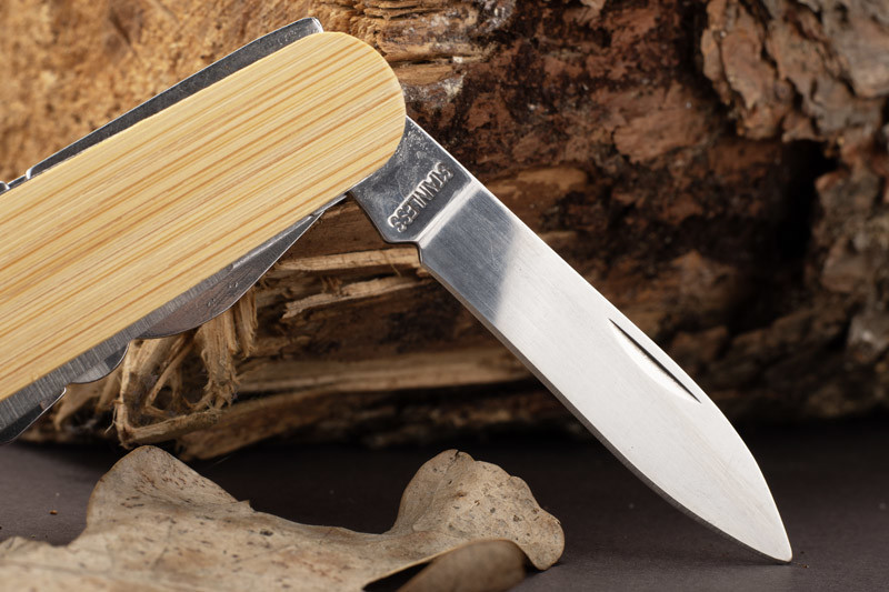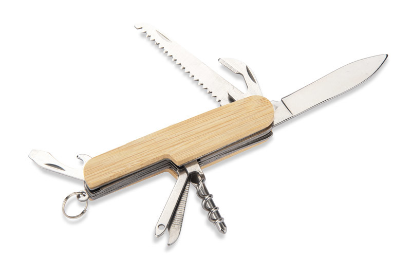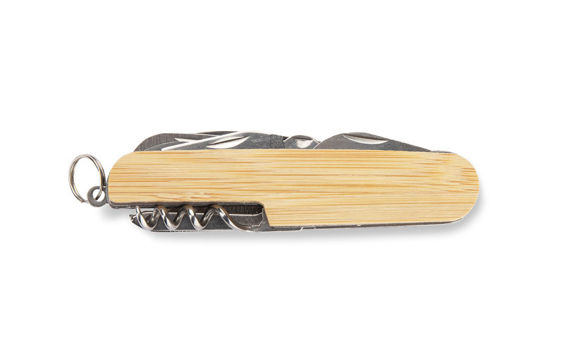 The KANA pocket knife with a bamboo handle stands out with its unique, natural look. Equipped with functions useful both in everyday life and outdoors: knife, saw, fish scaler, can and bottle opener, screwdriver, corkscrew, awl, leather punch, and a key ring. A practical promotional gadget that proves useful in any situation.