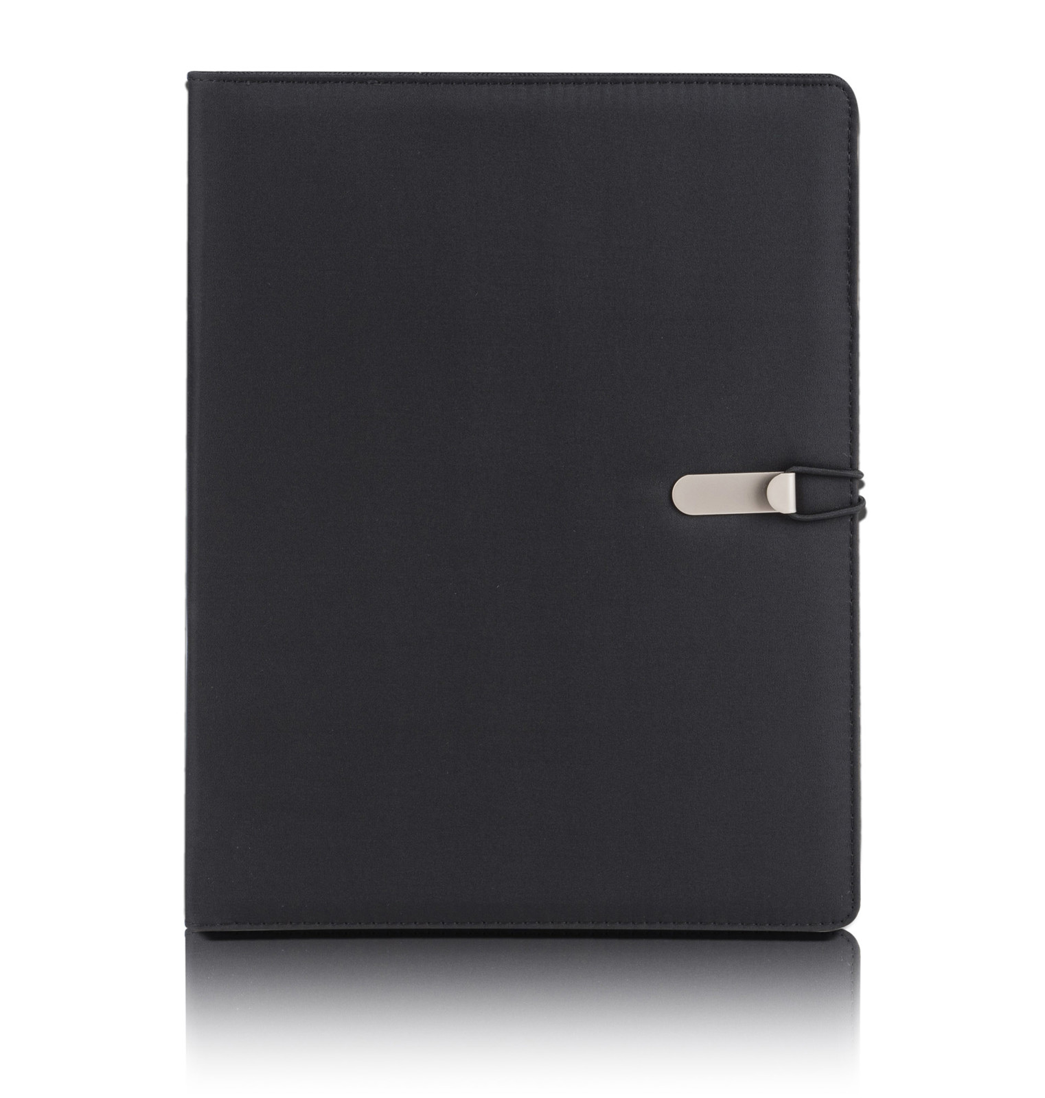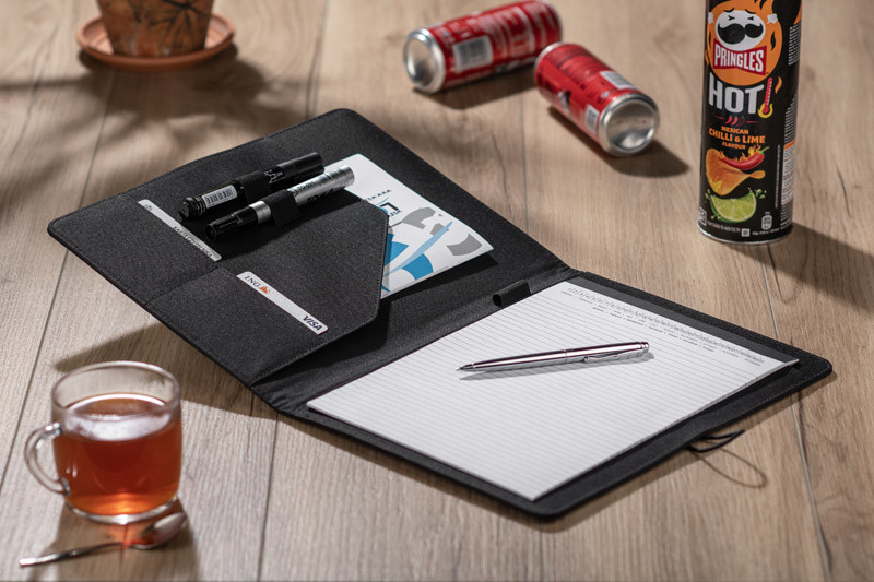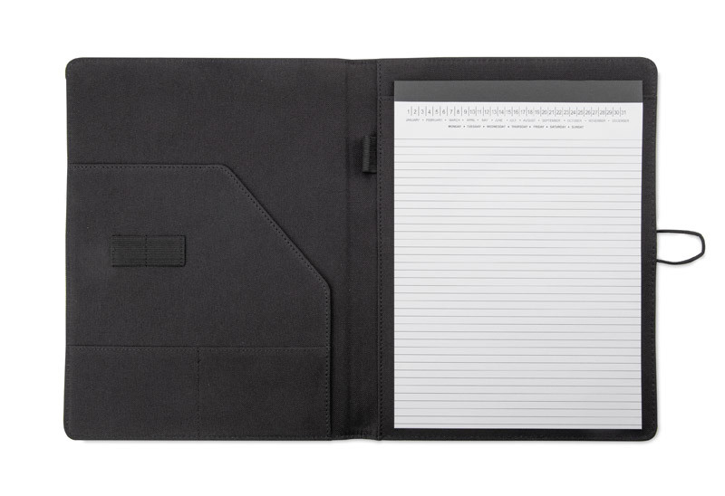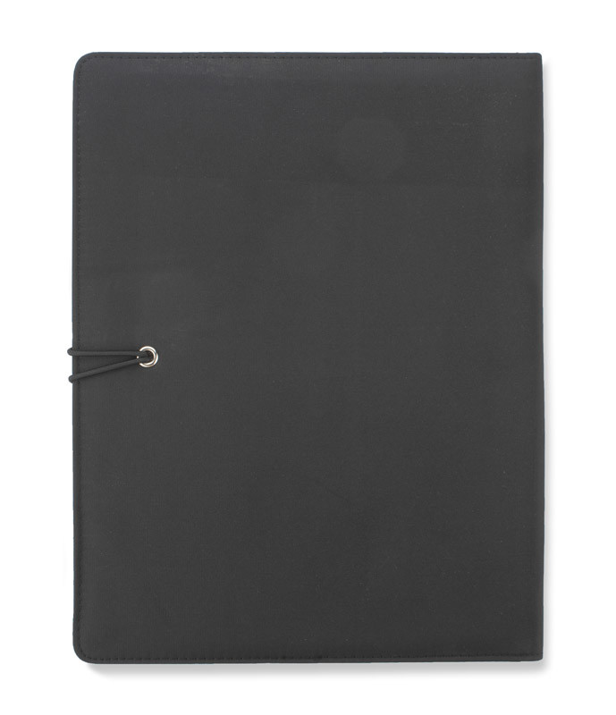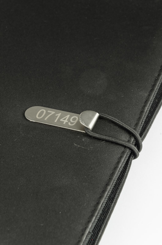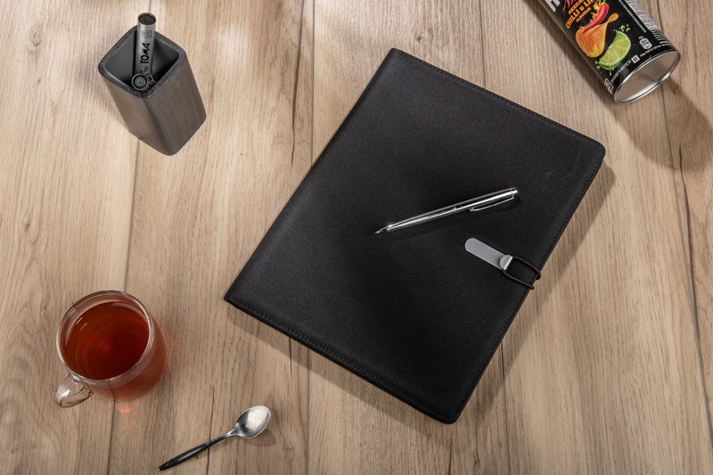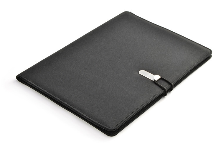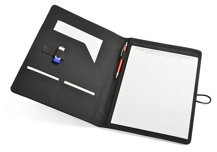 Simple and modern looking portfolio. Inside there is a large pocket.2 small pockets, 2 USB memory sticks holders, place for a ball pen, notebook. Portfolio is closed with a elastic band attached to a metal hook. Notebook is not stuck to the cover, but only slid on the pocket, which makes it possible to change the notebook.