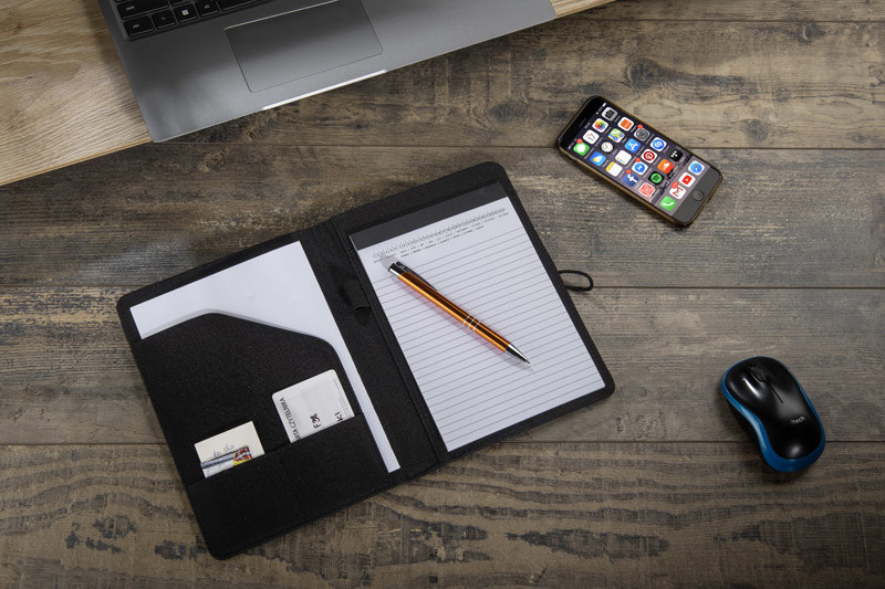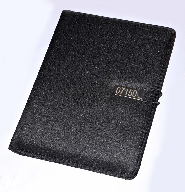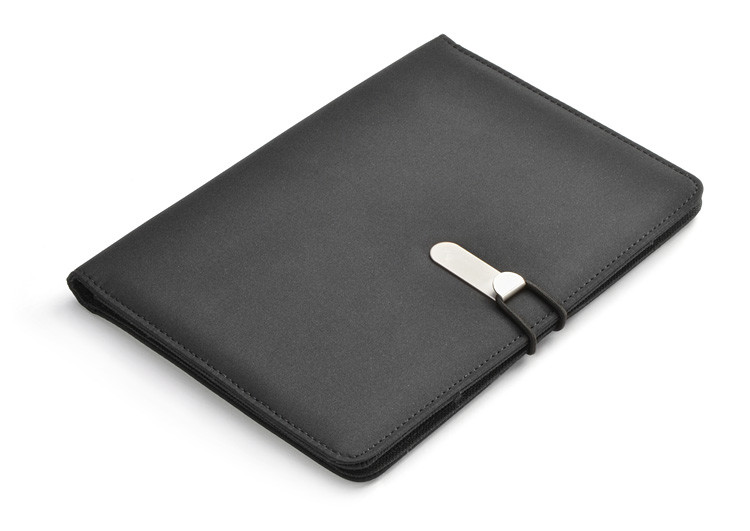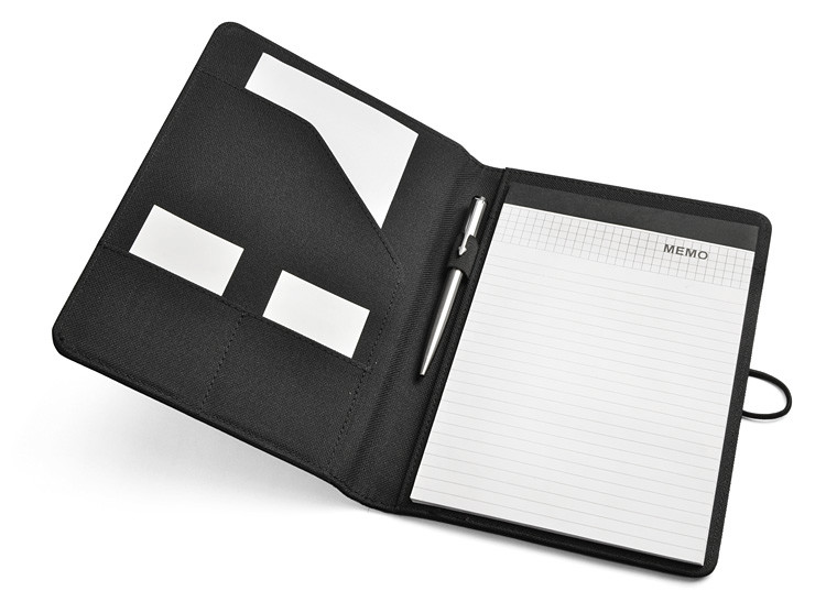Simple and modern looking portfolio. Inside there is a large pocket, small pockets, place for a ball pen, notebook. Portfolio is closed with a elastic band attached to a metal hook. Notebook is not stuck to the cover, but only slid on the pocket, which makes it possible to change the notebook.