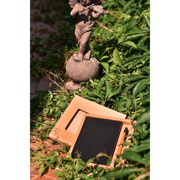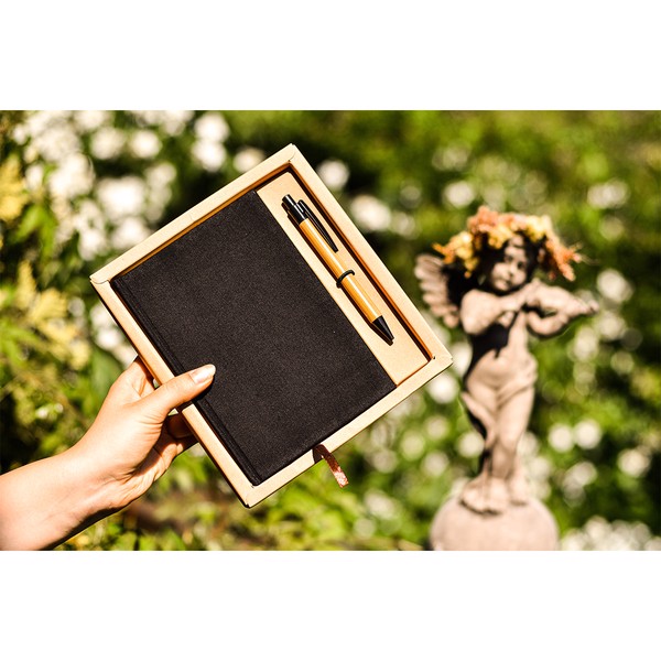 Set consisting of a printed linen cover desk- size notepad (90 pages, squared paper, 80 g/m2) and bamboo ballpen with plastic tip and clip. Blue refill.