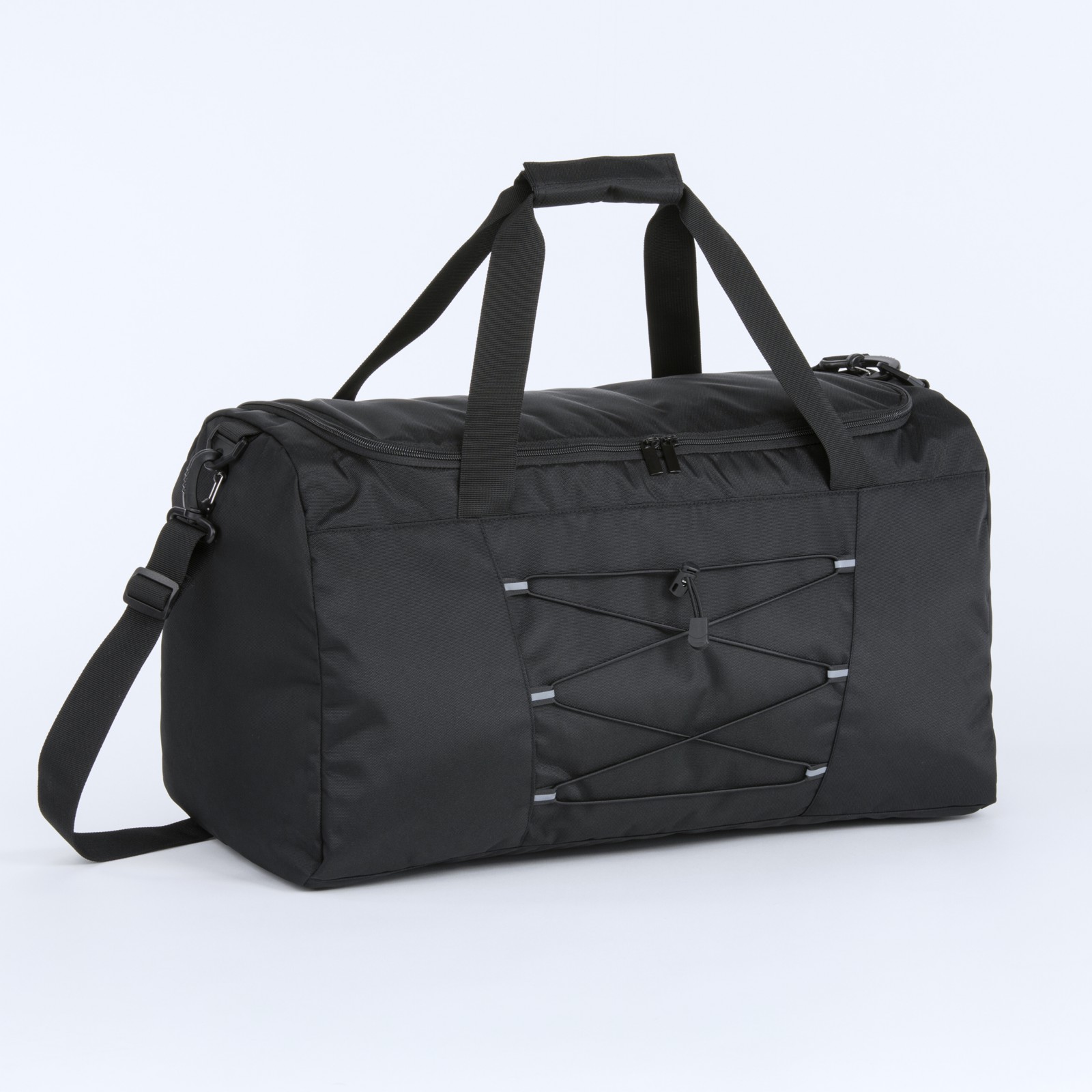 A black sports bag with a modern, minimalist design, made from durable polyester 900D, providing excellent resistance to mechanical damage and weather conditions. Its universal design is neutral and suitable for both women and men, making it perfect for the gym, sports trips, or short travels.• Made from durable polyester 600D, resistant to mechanical damage and weather conditions.• Main compartment: Spacious, equipped with a sturdy zipper, ideal for clothes, shoes, or other items.• Includes an inner pocket with a zipper, perfect for small items such as keys, documents, or a phone.• Elastic cords: Located on the front of the bag, useful for carrying additional items or as a decorative element.• Reflective elements: Enhance visibility and safety in low-light conditions.• Shoulder strap: Adjustable and detachable, ensuring comfortable carrying.• Carrying handles: Reinforced for convenient hand-carrying of the bag.