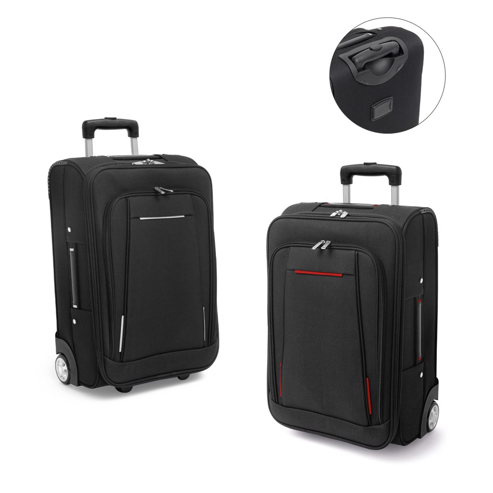 Travel Trolley in 600D and EVA with semi-rigid front compartment and lined interior. Identification tag on the back. Extendable aluminium handle with spring. The trolley has a capacity up to 28 L and weighs 2'95 kg. 345 x 520 x 195 mm