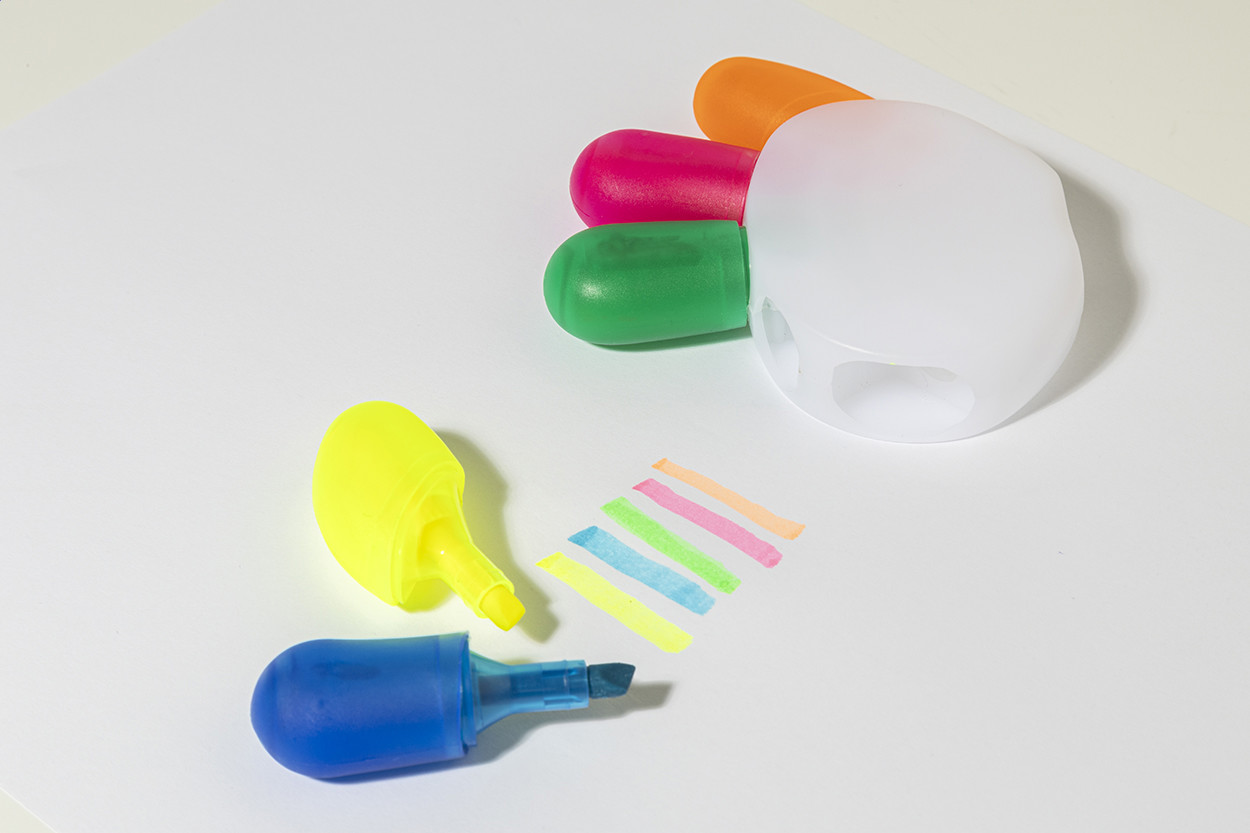 Hand shaped highlighter with 5 colours in recycled ABS plastic.