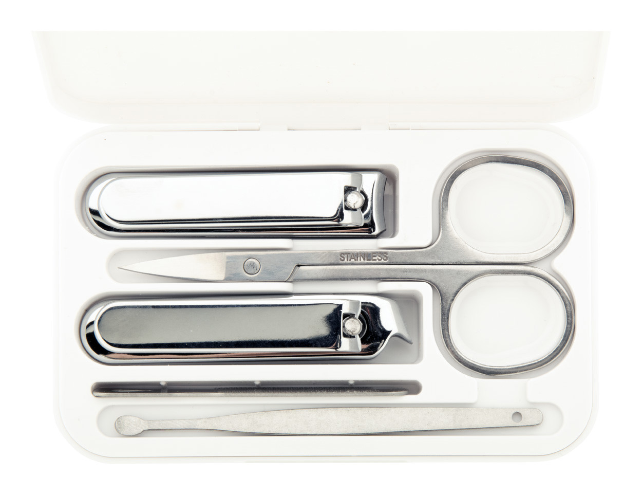 5 pc stainless steel manicure set in recycled ABS plastic case. Includes scissors, diagonal and normal nail clipper, nail file and cuticule remover.