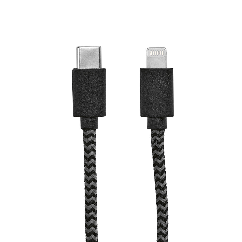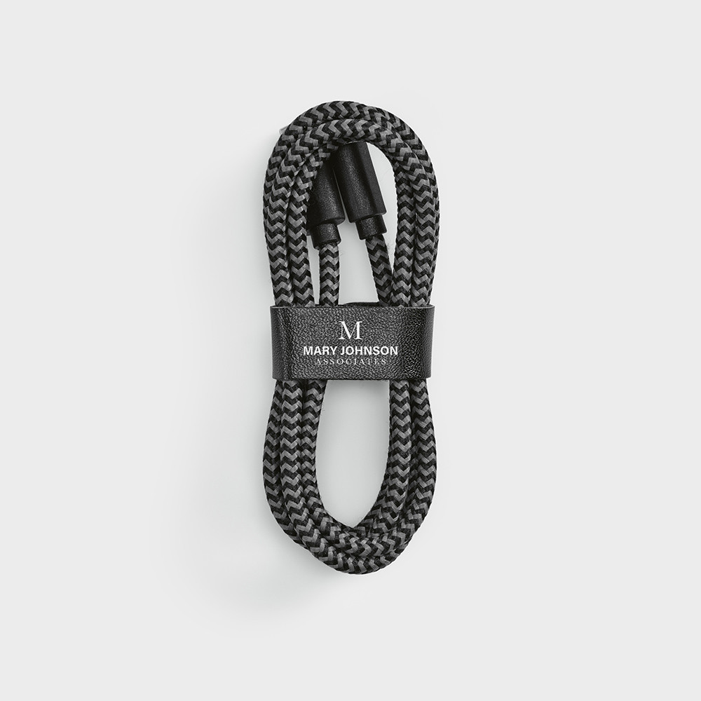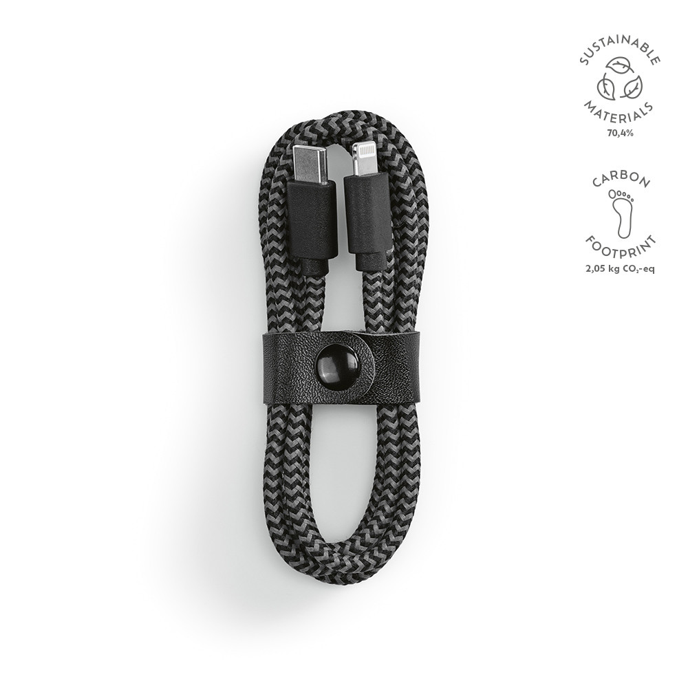 Ramanujan Cable 1m rPET fast charging cable. Seamlessly connecting USB-C to Lightning, Upgrade your tech with a sustainable twist. Tidy up with ease, includes a strap to keep your cable neatly folded. Each piece comes in its own eco-friendly kraft pouch.