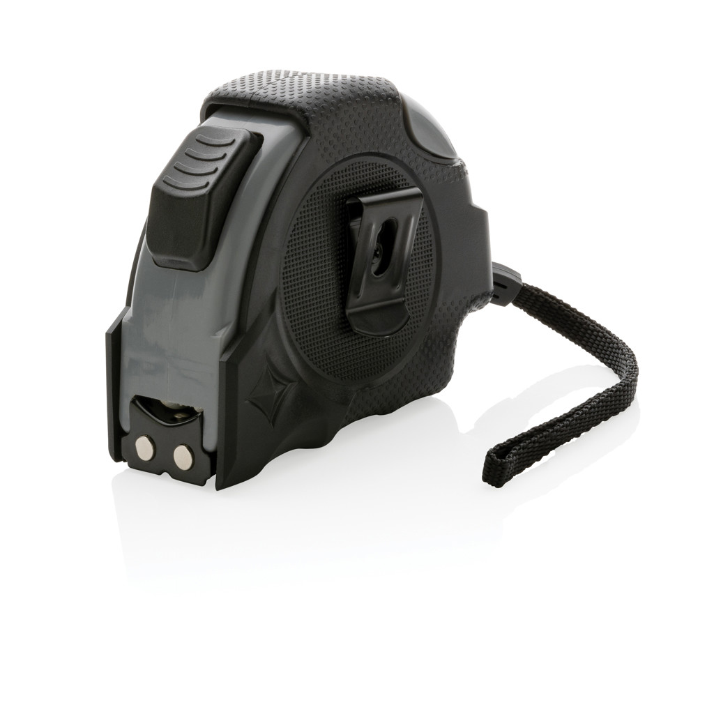Heavy duty 8 metre auto stop tape made with RCS (Recycled Claim Standard) certified recycled ABS. Total recycled content: 11% based on total item weight. RCS certification ensures a completely certified supply chain of the recycled materials. With deluxe rubber grip for extra control. With release button on top and bottom which can be used to own preference. With 25mm single sided tape, yellow with black carbon steel hook with two integrated magnets. With polyester wrist strap. Packed in FSC® mix kraft packaging