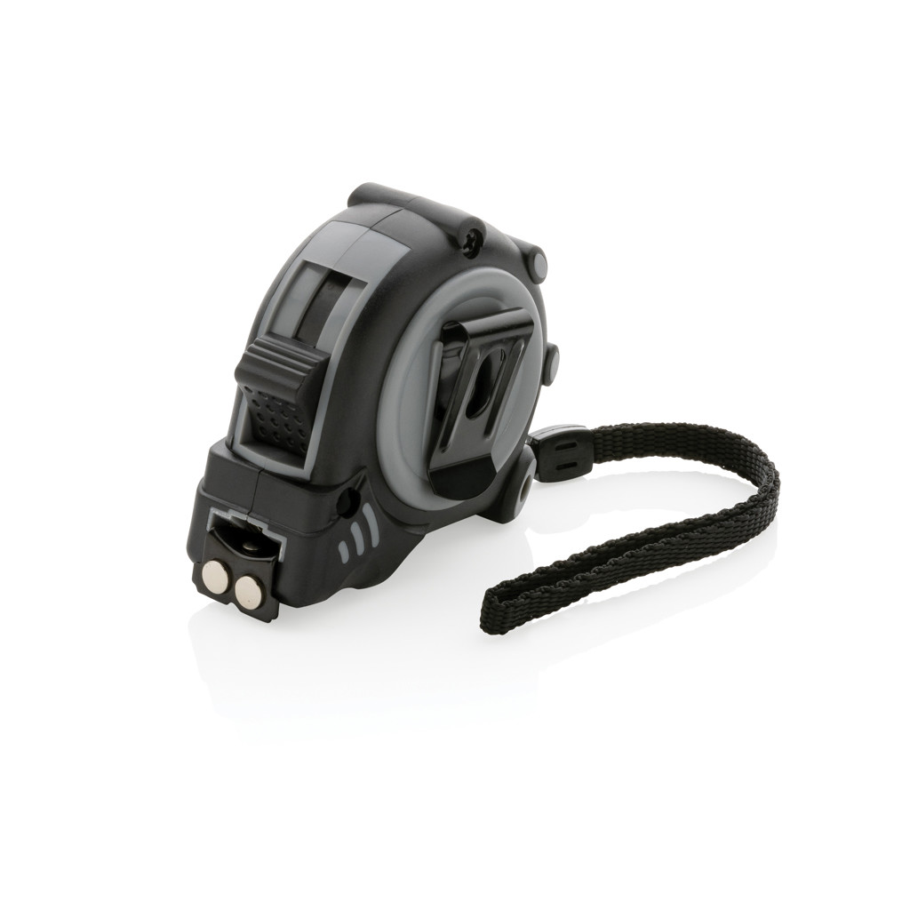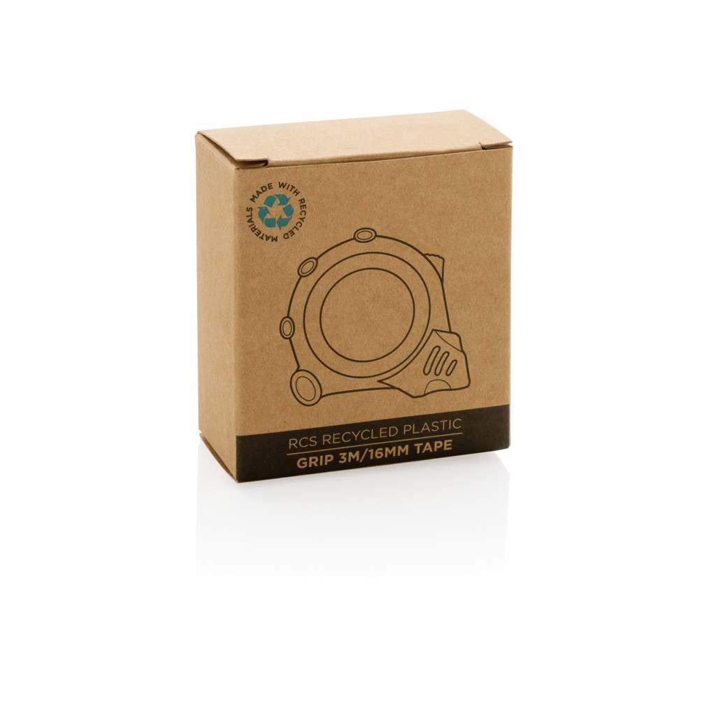 3 metre tape made with RCS (Recycled Claim Standard) certified recycled ABS. Total recycled content: 19% based on total item weight. RCS certification ensures a completely certified supply chain of the recycled materials. With deluxe TRP rubber grip for extra control. With release/hold button. With 16mm single sided tape, yellow with black carbon steel hook with two integrated magnets. With polyester wrist strap. Packed in FSC® mix kraft packaging