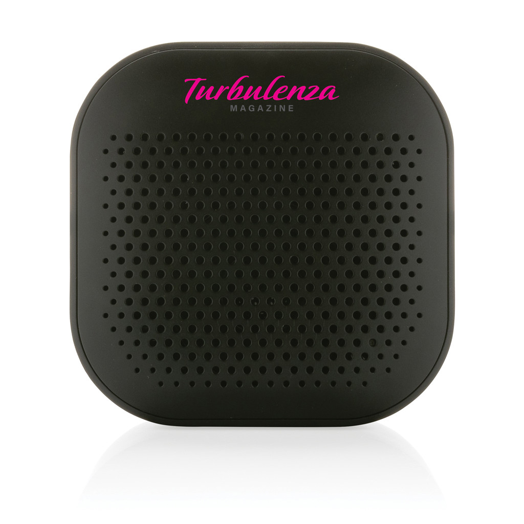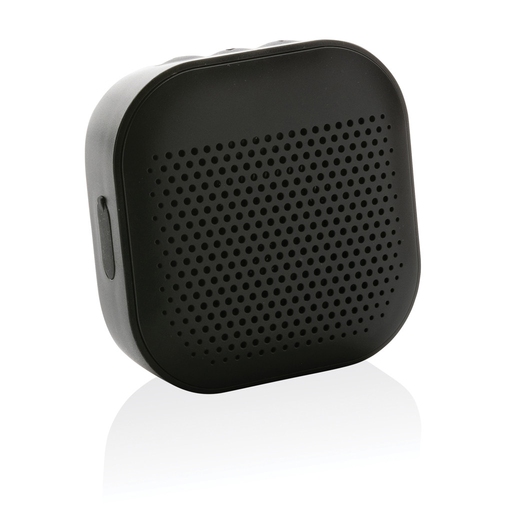 3W wireless speaker made with RCS (Recycled Claim Standard) certified recycled ABS. Total recycled content: 41% based on total item weight. RCS certification ensures a completely certified supply chain of the recycled materials. The speaker is equipped with a 400 mAh battery to ensure up to 3.5 hours of playing time and BT5.3 for smooth connection with clear sound. Connection range up to 10 metres. With mic to answer calls. Packed in FSC® mix box. Including RCS certified recycled TPE charging cable. Item and accessories 100% PVC free. IPX 4 waterproof.
