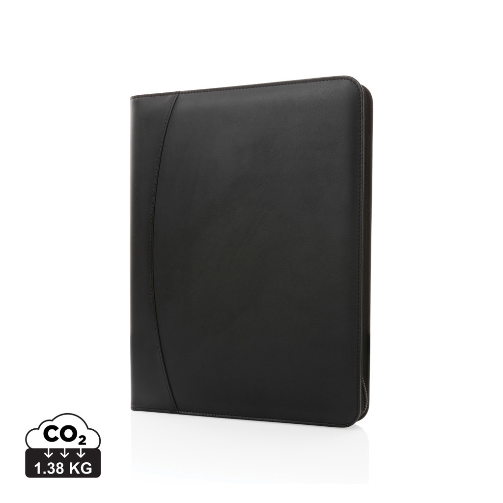 This beautiful RCS rPU deluxe tech portfolio with zipper is made with RCS (Recycled Claim Standard) certified recycled materials. RCS certification ensures a completely certified supply chain of the recycled materials. The smooth, luxury surface gives the portfolio a chic look. Inside the A4 portfolio you can find a lined 64 gm/2 recycled paper notepad containing 20 pages. Inside there’s 1 phone size pocket, a phone holder, pen loop and 2 business card slots. Made with 100% recycled RCS certified recycled PU. Total recycled content: 14% based on total item weight. PVC free.