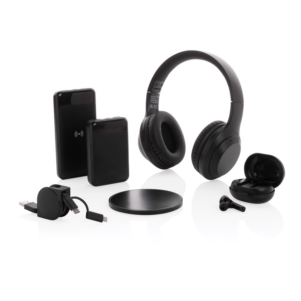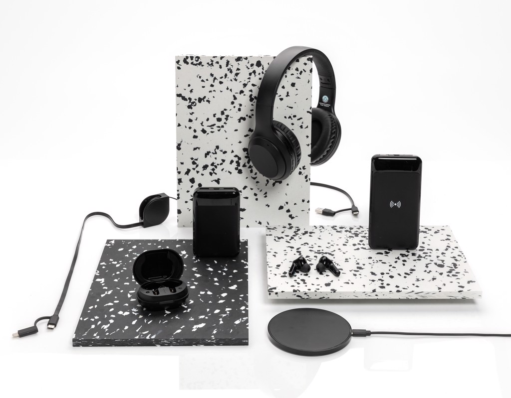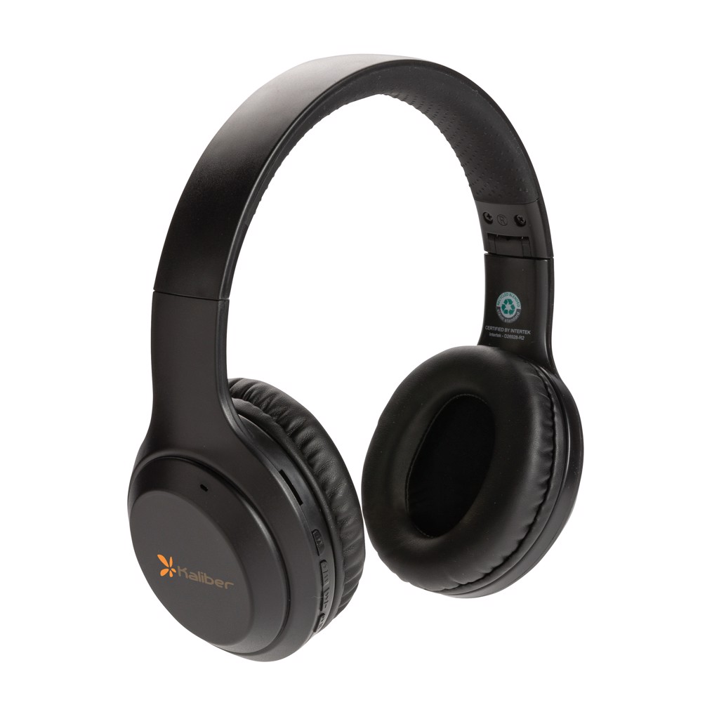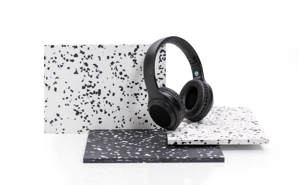 Foldable wireless headphone where the case is made out of RCS certified recycled ABS plastic. RCS (Recycled Claim Standard) is a standard to verify the recycled content of a product throughout the whole supply chain. Total recycled content: 65% based on total item weight. The wireless headphone uses BT 5.0 for super smooth connection and long lasting play-time. The over ear design of the earbuds allows a perfect sound experience. The built-in 200 mAh lithum battery allows a play time up to 6 hours and can be fully re-charged in 1.5 hours. Operating distance up to 10 metres. With mic and pick up function. Item and accessories are PVC free. Including PVC free recycled TPE material charging cable.