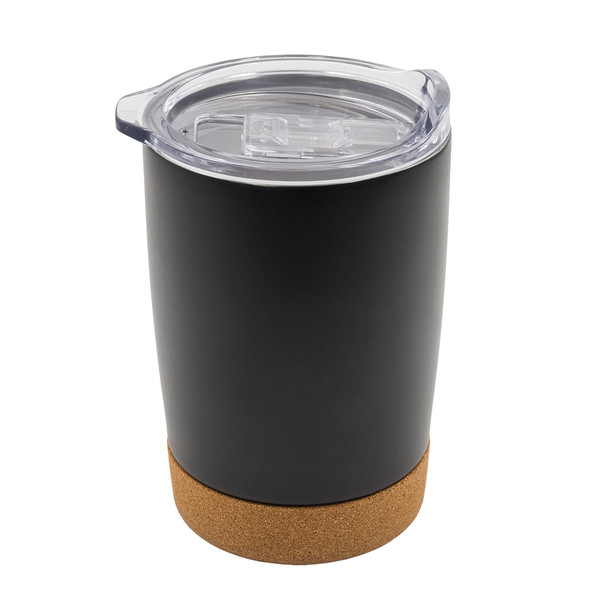 Business gift set, consisting of a vacuum mug, umbrella, notebook and pen. Packed in an elegant black box. A5 notebook with a hard cover, 80 grid sheets of 70 g/m². Vacuum mug with a transparent lid, capacity 350 ml. Made of recycled stainless steel. Matte black body and cork base. Umbrella made of RPET 190T pongee material, ribs made of fiberglass.. It has a cork handle. Packed in a waterproof pouch. Pen with cork body. Blue refill 1.0 mm.