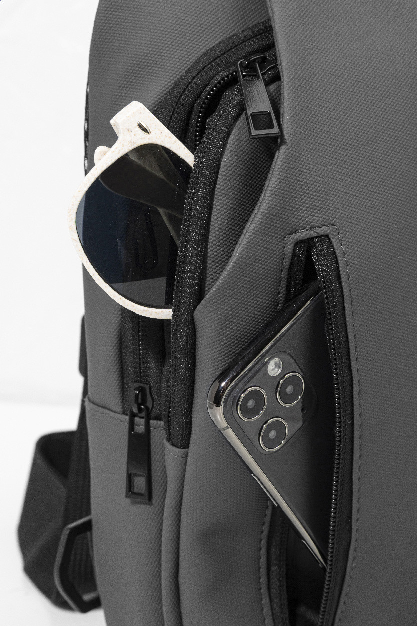 Waterproof RPET crossbody sling bag with zipped pockets, buckle closure and padded back. With adjustable shoulder strap featuring left and right side positions. PU coated 600D RPET polyester, with distinctive RPET label.