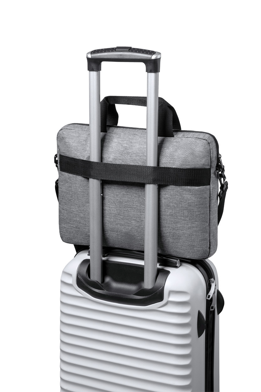 RPET document bag with zipped main compartment, adjustable shoulder strap, trolley strap, padded laptop (15") and tablet (10") compartments. 600D RPET polyester.