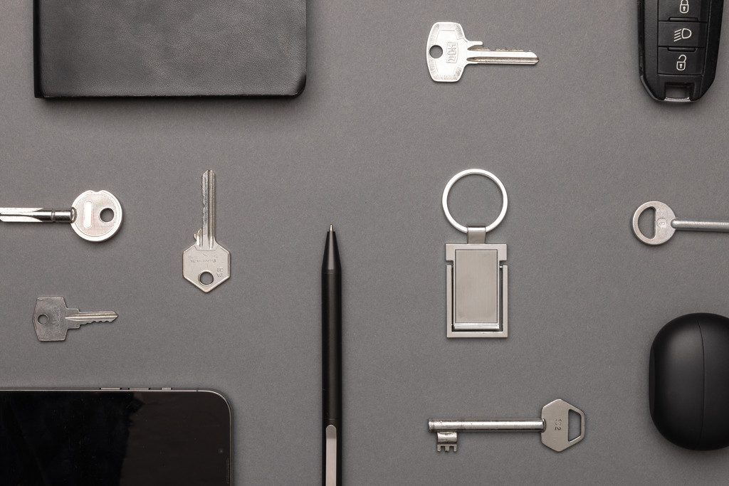 Luxury keychain with phone stand made with RCS recycled zinc alloy. Total recycled content: 86% based on total item weight. RCS certification ensures a completely certified supply chain of the recycled materials. Packed in paper bag.