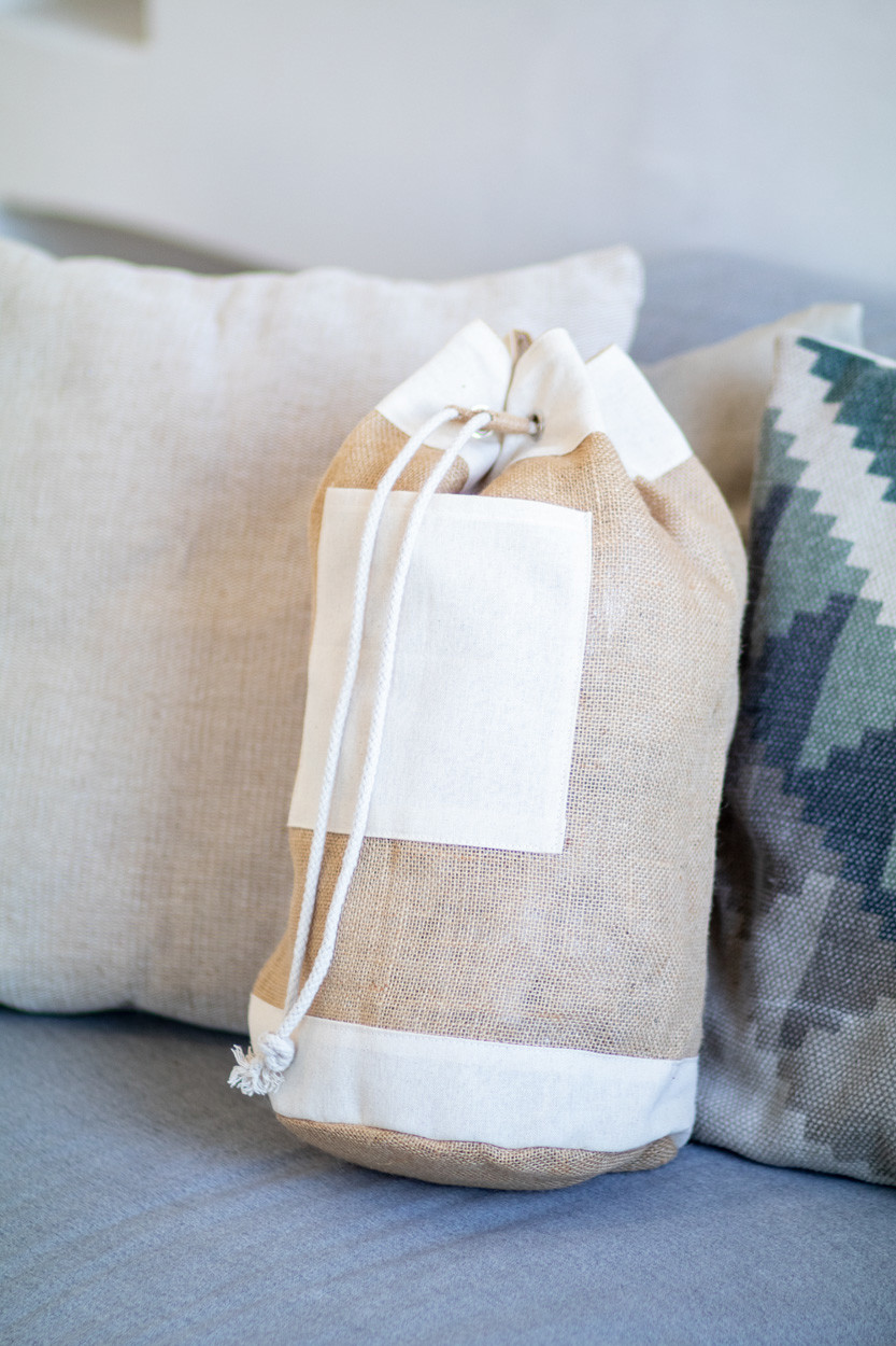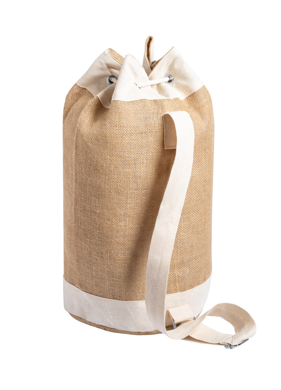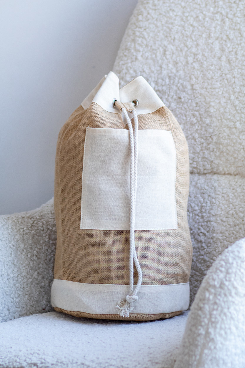 Jute sailor bag with cotton front pocket and drawstring closure.