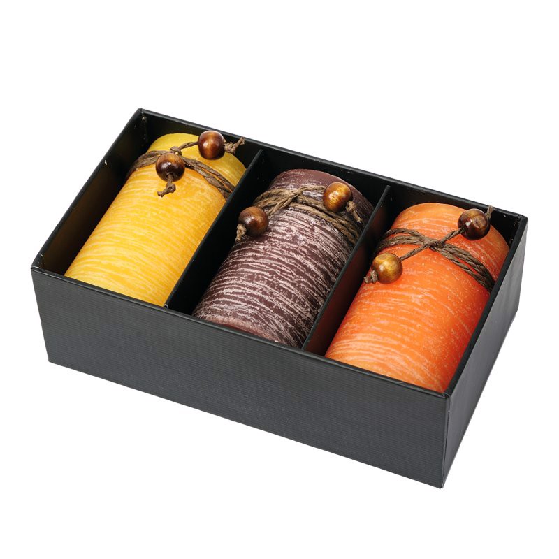 Scented candles set in cardboard gift box. The scents of vanilla, coffee and ocean.The lid is covered with embossed paper. Burn time 16 hours.