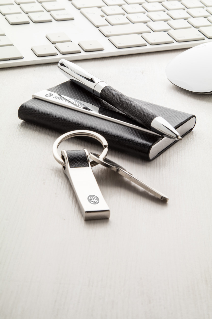 Metal and PU leather set with ballpoint pen, business card holder and keyring. In black gift box. André Philippe brand product.
