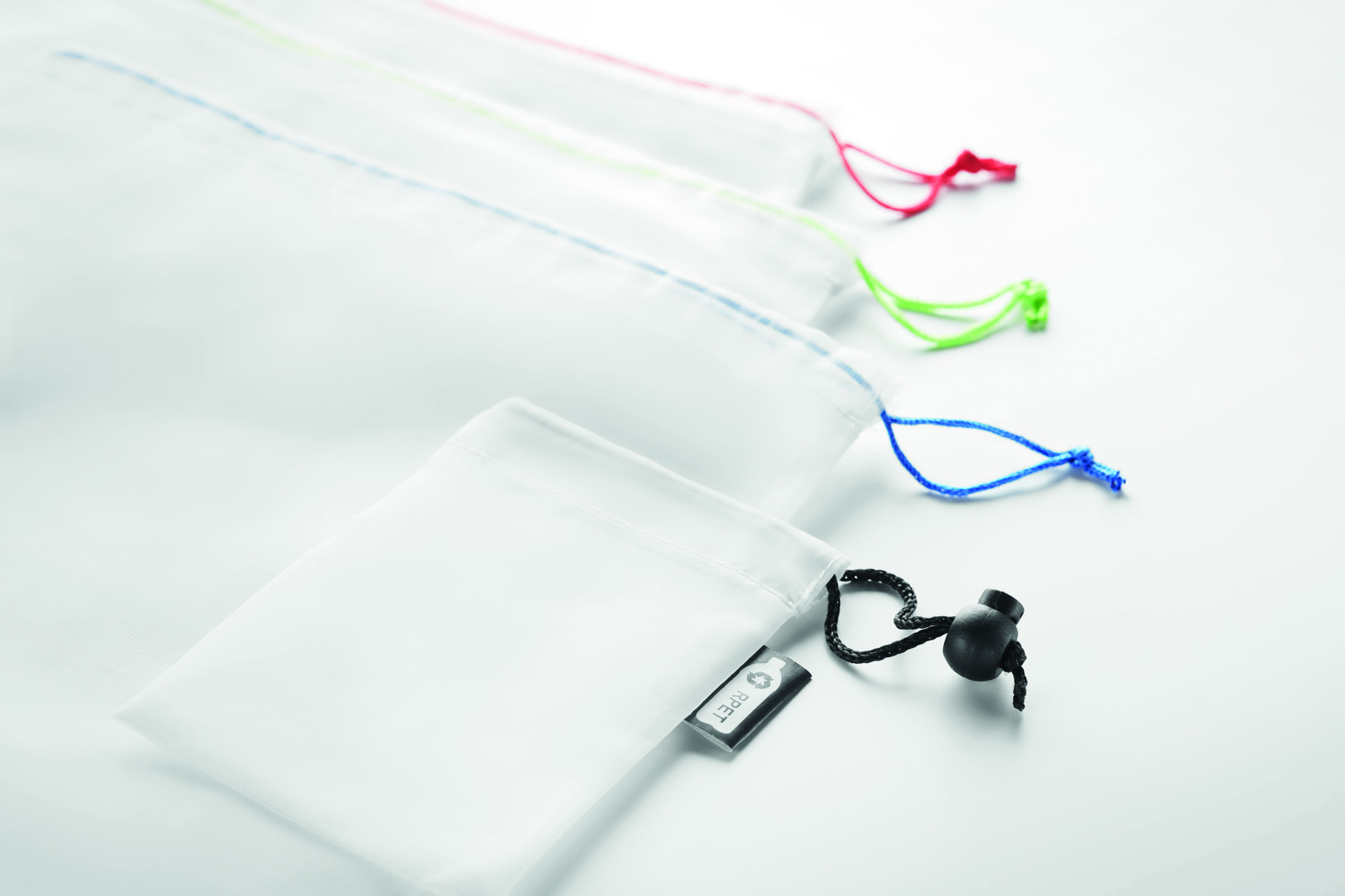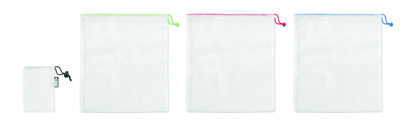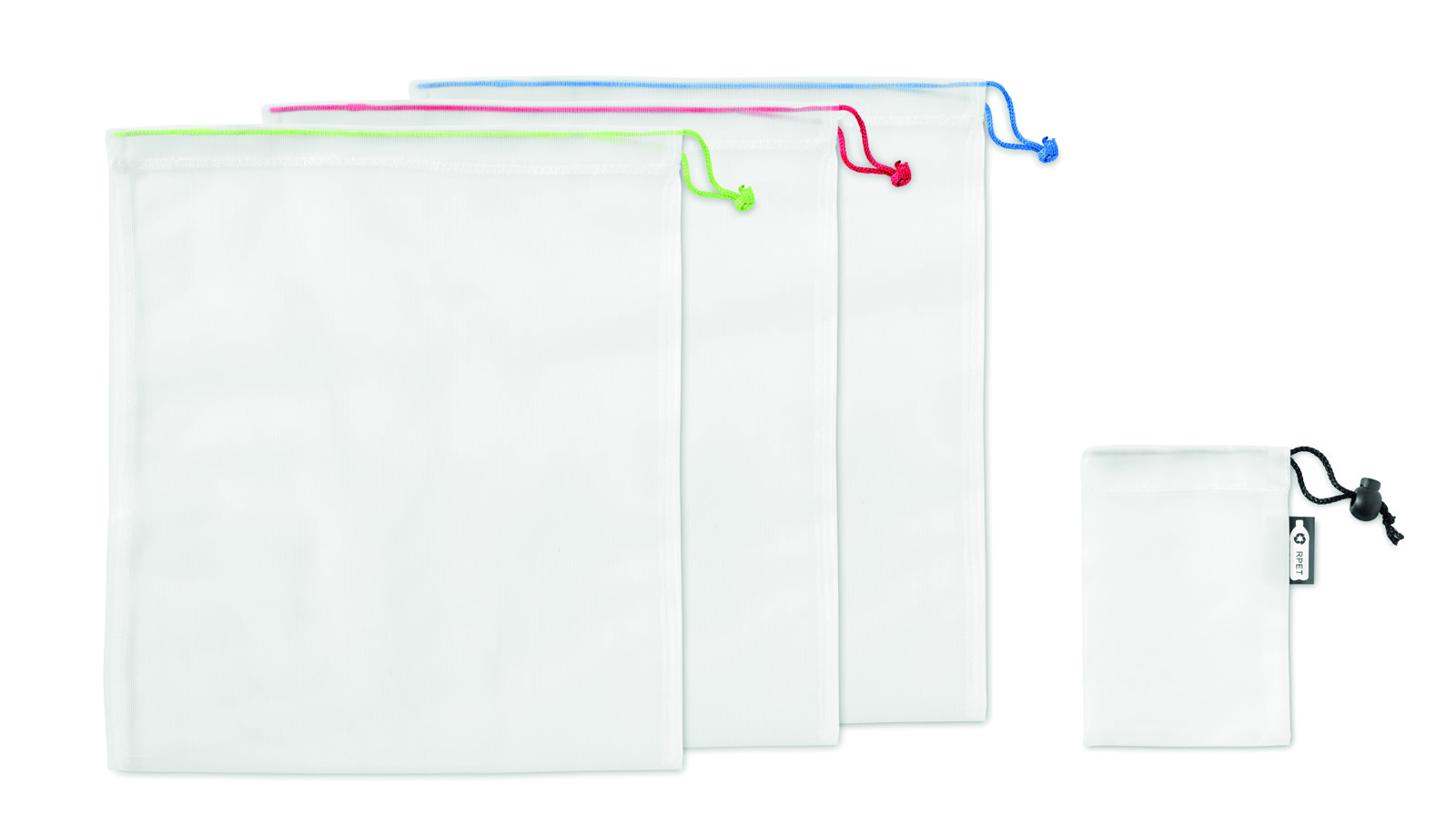 Set of 3 RPET mesh bags in RPET pouch. Reusable fruit or vegetable bags as an alternative for plastic bags. Drawstring closure. Washing machine-friendly, BPA free and food-safe.