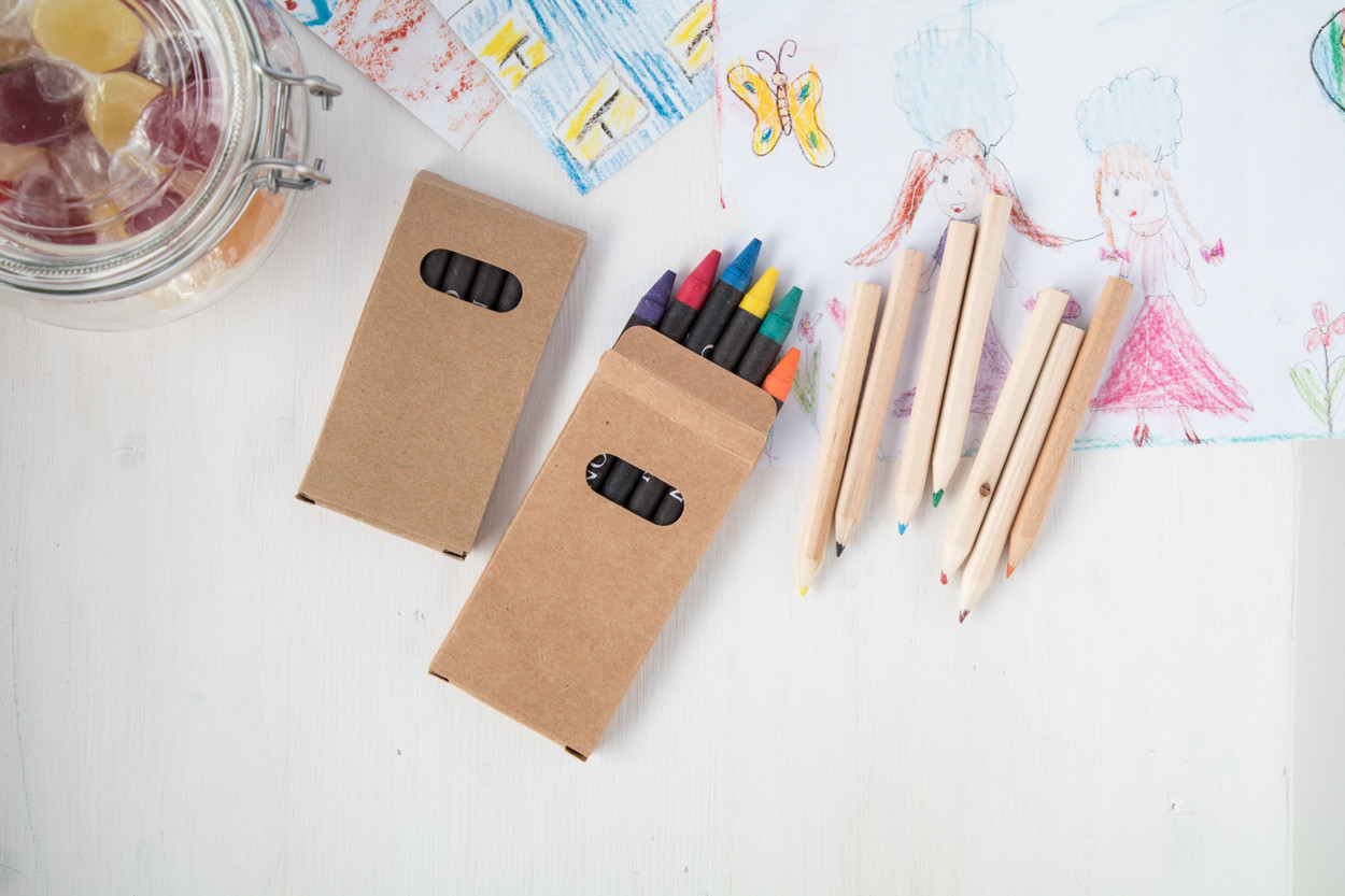 Black paper covered, coloured crayons (6 pcs) in paper box.