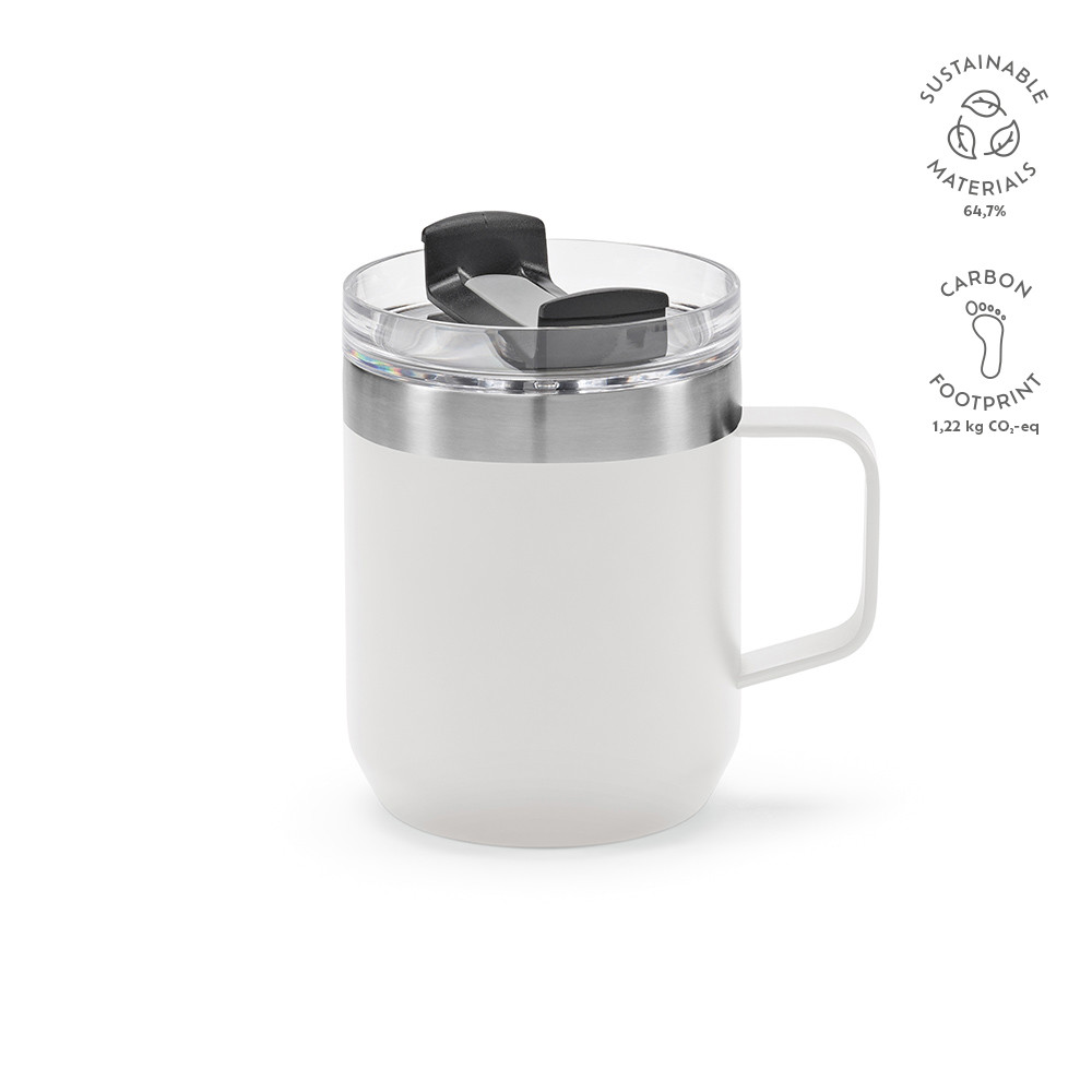 Shinano 440ml (350ml net) mug crafted from recycled stainless steel. Vacuum-insulated for ideal temperature (6 hours hot and 18 hours cold). Rotating lid with 3 functions: drinking, placing a straw and closing. Available in 7 stylish colours. A sustainable choice packed inside an individual kraft box.