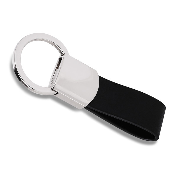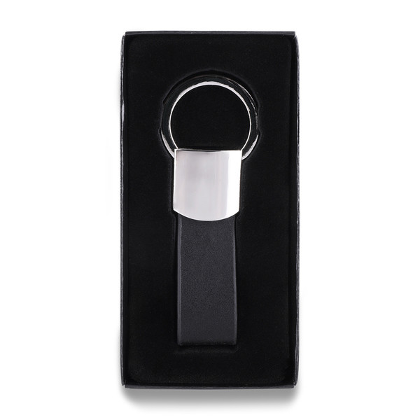 Elegant keyring made from shiny metal and PU. Packed in black gift box.