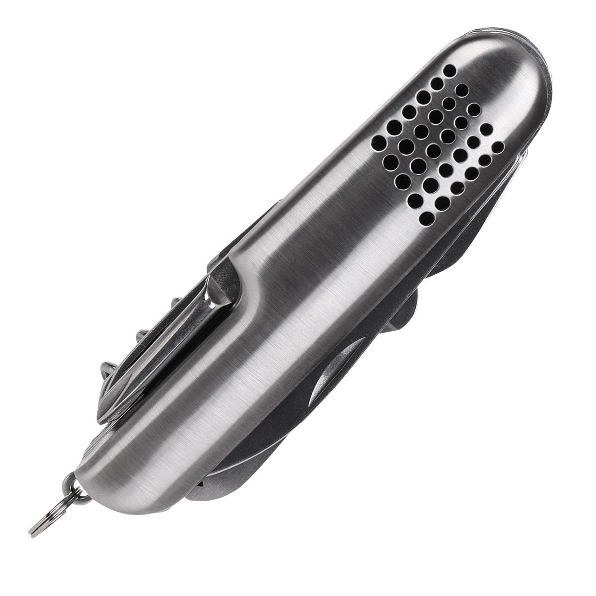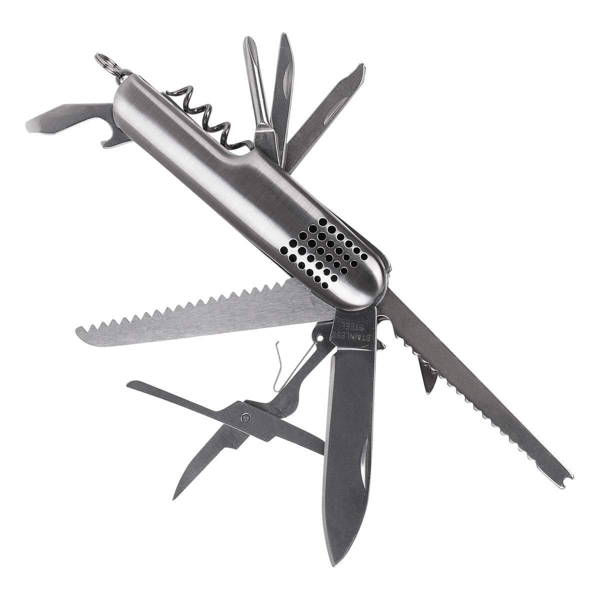 Great 13-function stainless steel pocket knife. It contains a flat-head screwdriver, philips, extra fucntion tools and scissors. Packed in black polyester case.
