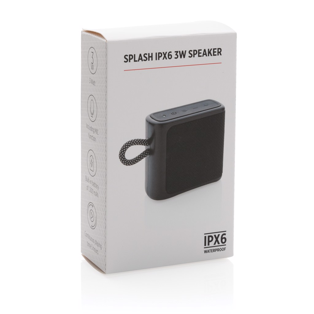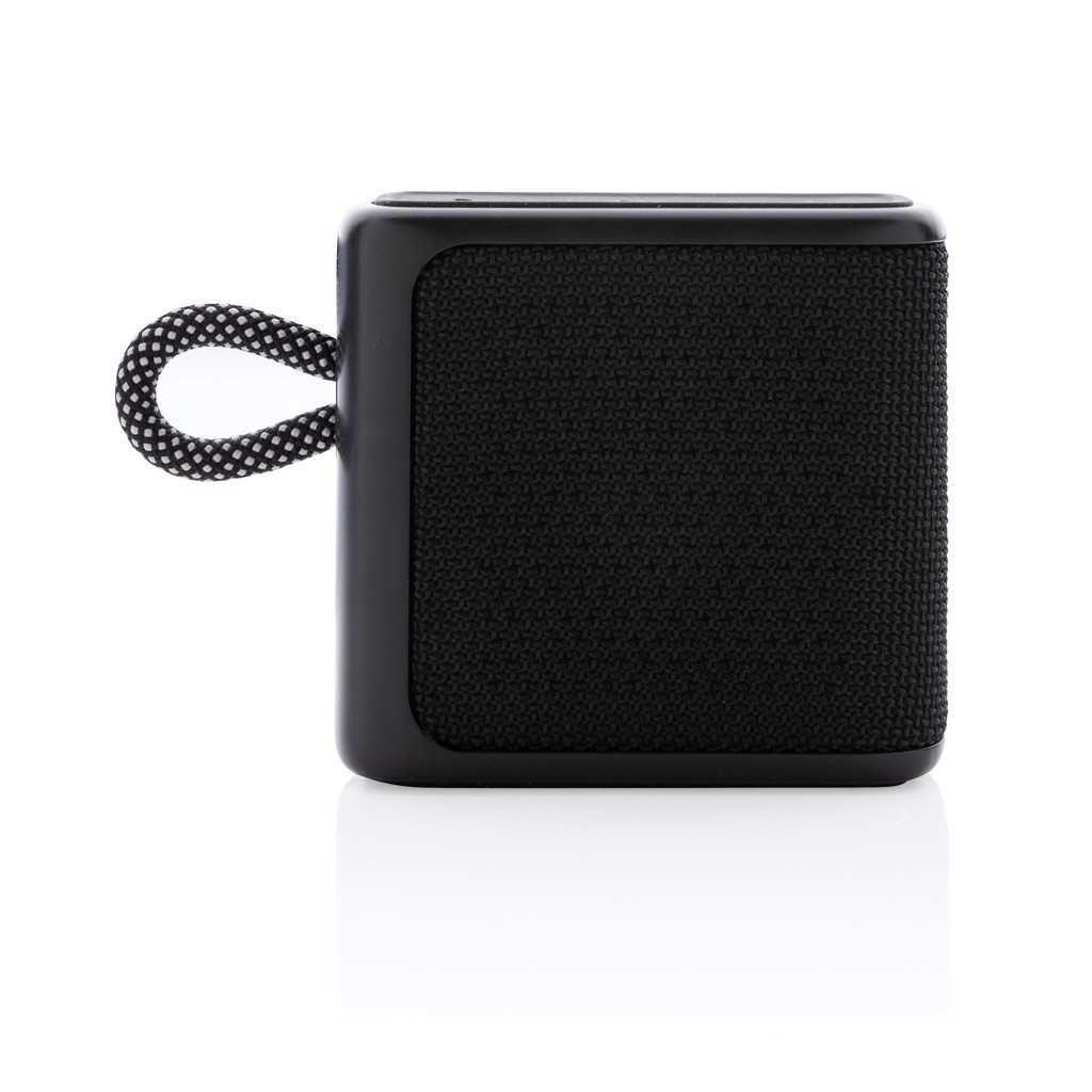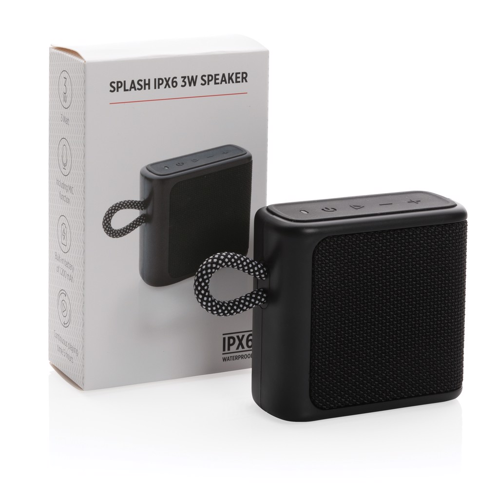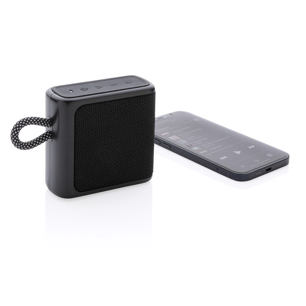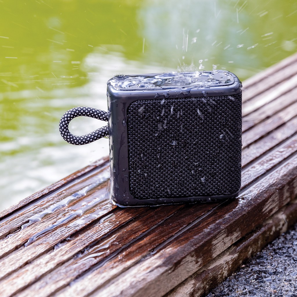 IPX 6 waterproof 3W speaker made from ABS and fabric. The 1200 mah battery allows a play time of up to 5 hours. Re-charging takes 3 hours. Operating distance up to 10 metres using BT 5.1 With mic and pick up function to answer calls. With type C input port and type C charging cable.