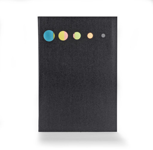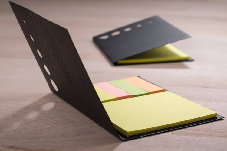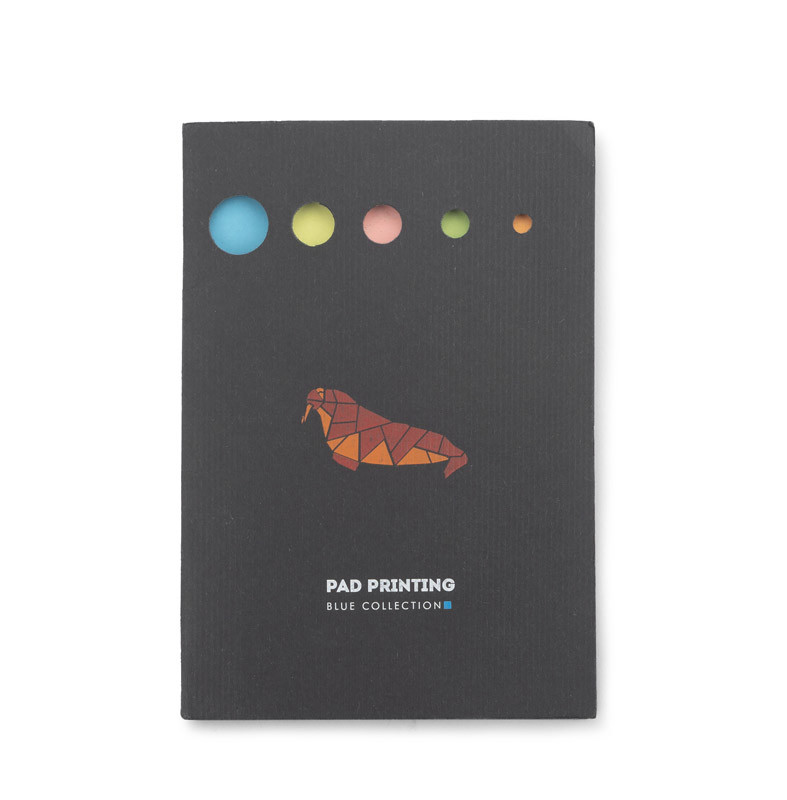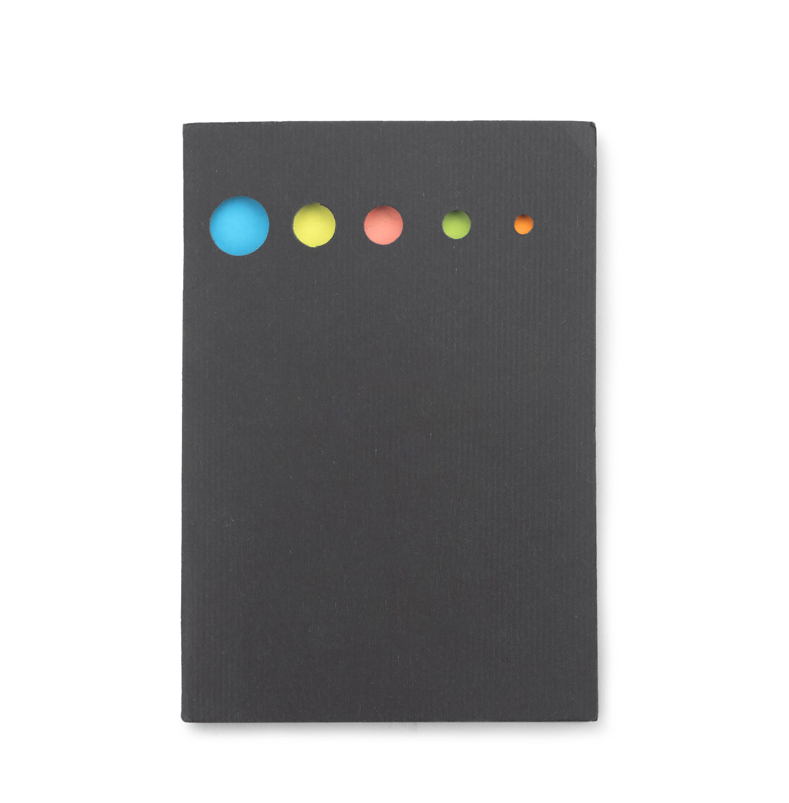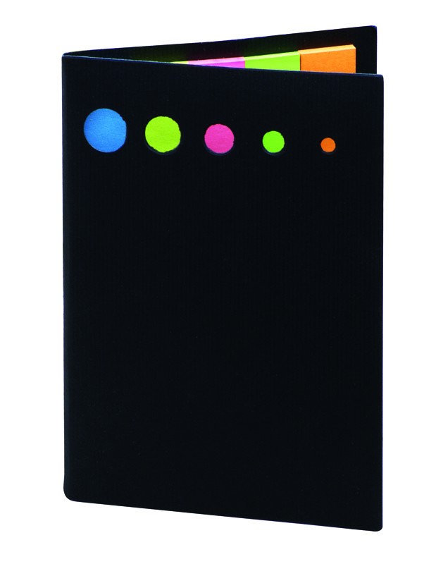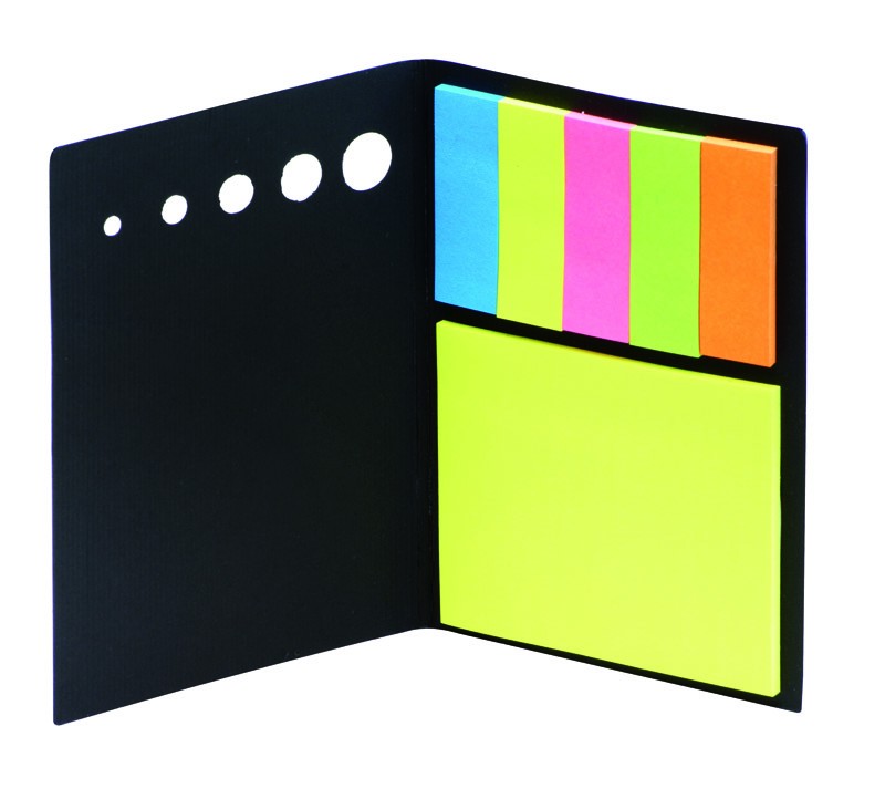 Self-stick 5-colour paper sheets together with a notebook, placed into a black cover. Logo might be pad printed on the cover.