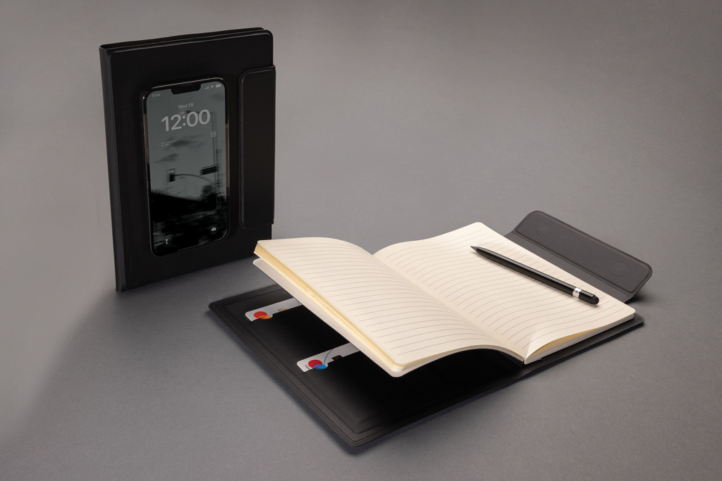 A5 portfolio, recycled polyester PU with magnetic closure and magnetic phone holder that is compatible with magsafe iPhones 12 or higher, inside A5 notebook with lines, innerp ages are FSC® certified and 64 sheets/128 pages; cream paper colour with lines; paper weight 80gsm, documents pocket and 2 business card slots. Notebook is refillable.
