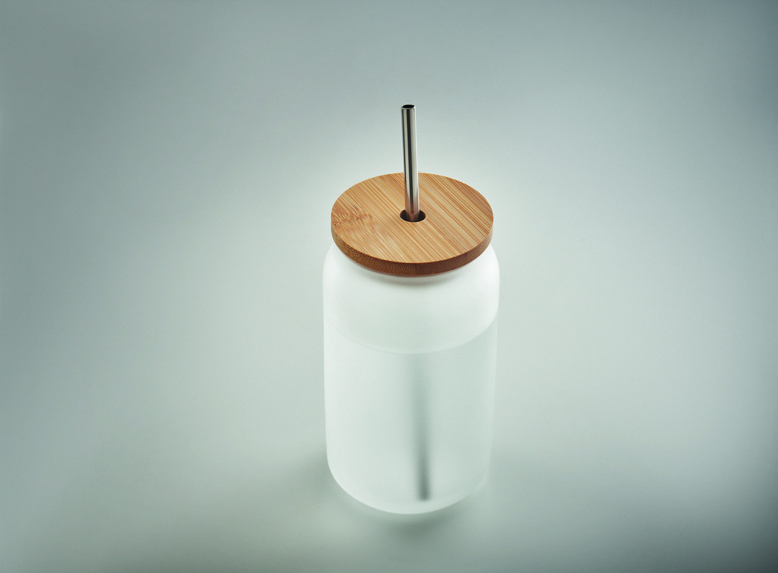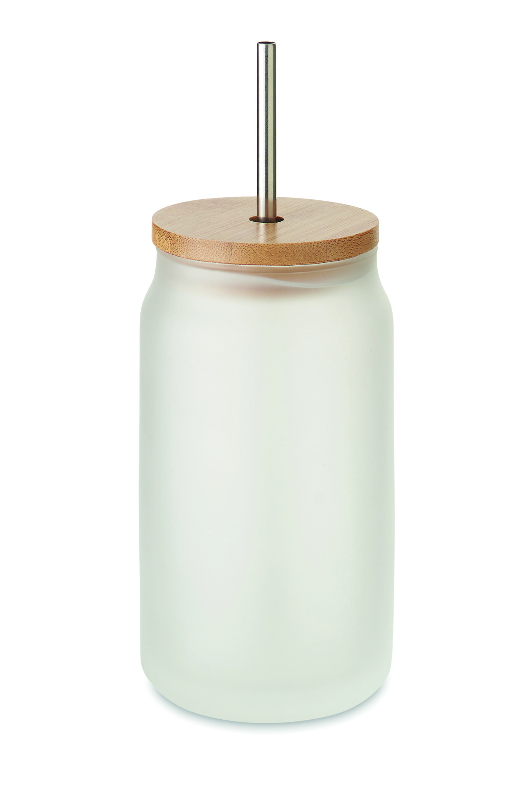 Mason cocktail jar with special coating for sublimation with bamboo lid. Including a Stainless Steel straw. Capacity:400 ml. Bamboo is a natural product, there may be slight variations in colour and size per item, which can affect the final decoration outcome.