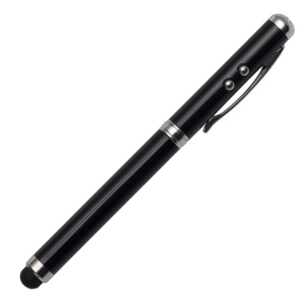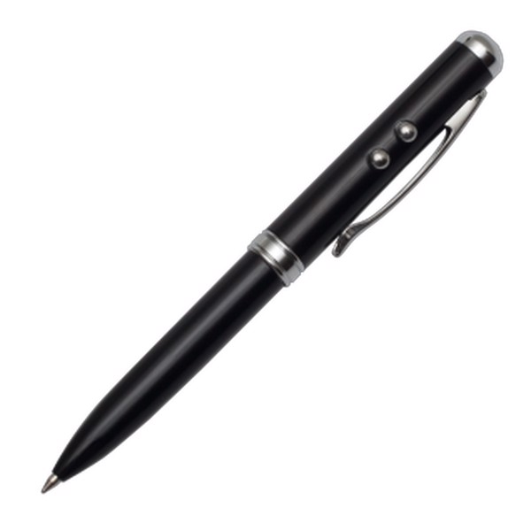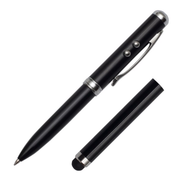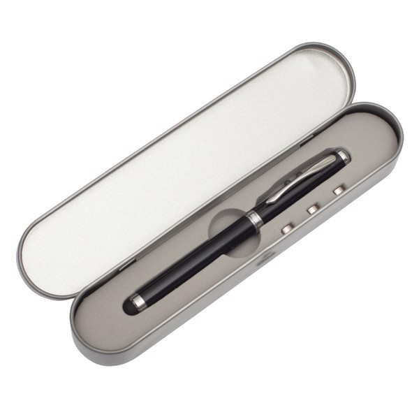 Ballpen (blue refill) with laser pointer, LED torch and touch tip for mobile devices. 3 x LR41 batteries included. Packed in a silver giftbox.