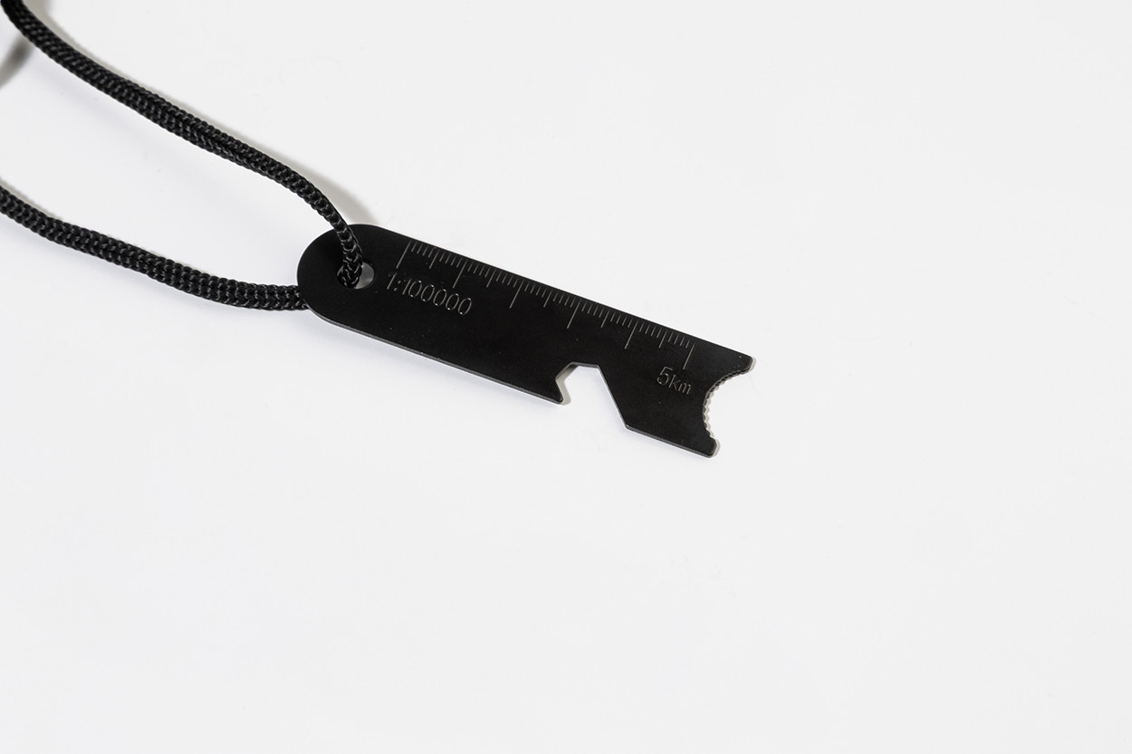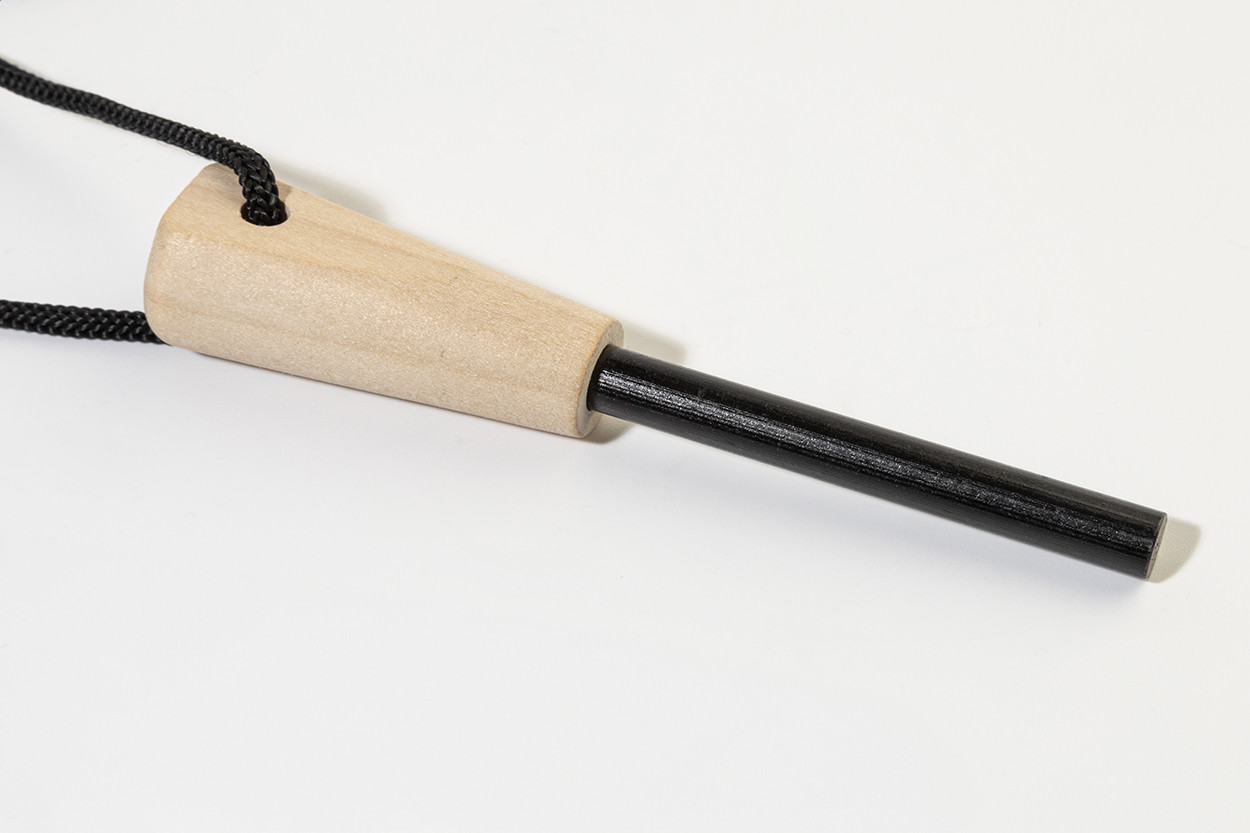 Survival fire starter tool with wooden handle and multifunctional stainless steel scraper equipped with a ruler, bottle opener, and hex key.