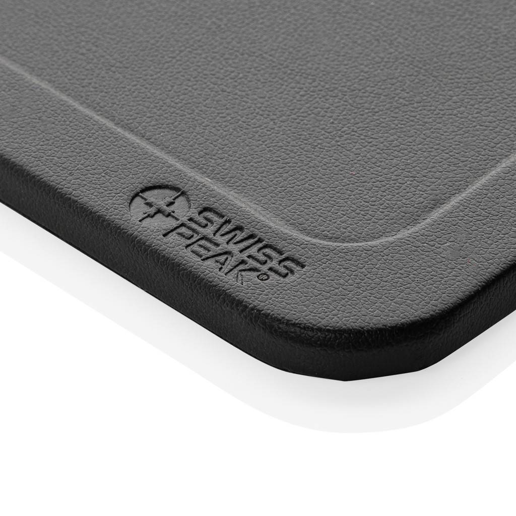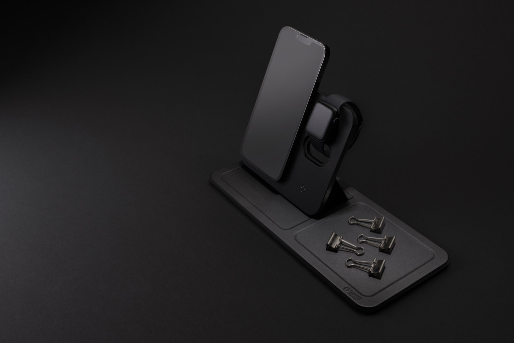 Luxury and foldable 3-in-1 wireless charger with desk tray made with RCS recycled PU.Total recycled content: 5% based on total item weight. RCS certification ensures a completely certified supply chain of the recycled materials. The wireless charger comes equipped with a magnetic 15W wireless charger and an additional 5W wireless charger suitable for earbuds cases or other small wireless chargeable devices and a 2.5W wireless charger for smartwatches ( Apple watches only). Including 120 cm TPE cable. Packed in FSC® mix packaging. Item and accessories 100% PVC free. Minimum Input: 9V/3A for optimal use. Output: Phone: 9V/1.1A; 9V/1.67 A/(15W), Earbuds: 5V/1A (5W), Watch: 5V/0.5A.