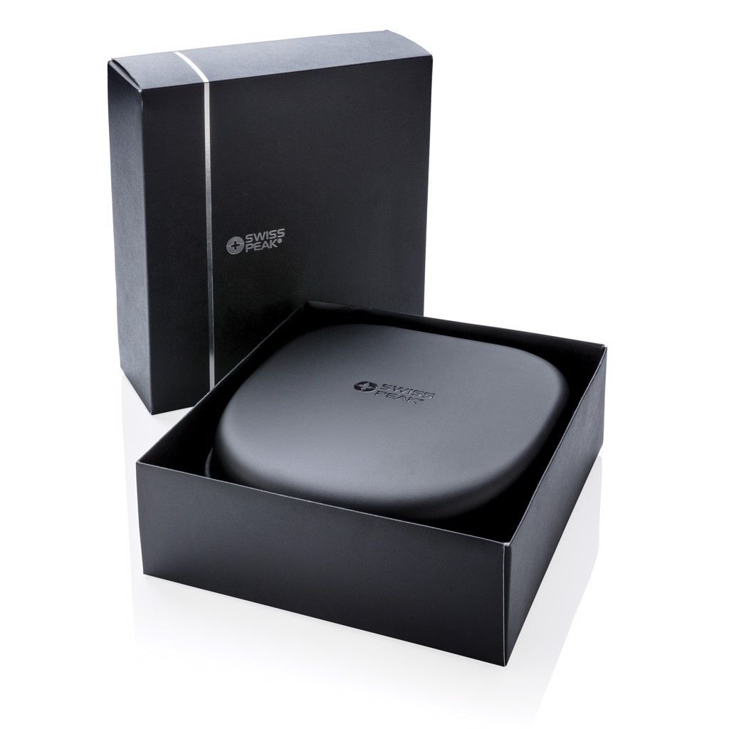 Wireless stereo headphone with high quality audio for a perfect sound experience. The 300 mAh battery allows you to listen to your music for up to 11 hours on one charge and recharging takes only 1.5 hours. Operating distance up to 10 metres. The headphone can be folded flat so it will fit in the Swiss Peak EVA travel pouch which is included. With aluminum casing and PU air cushions, the headphone is comfortable enough to wear for hours. With mic to receive calls. Including AUX cable.
