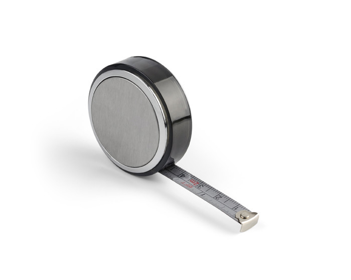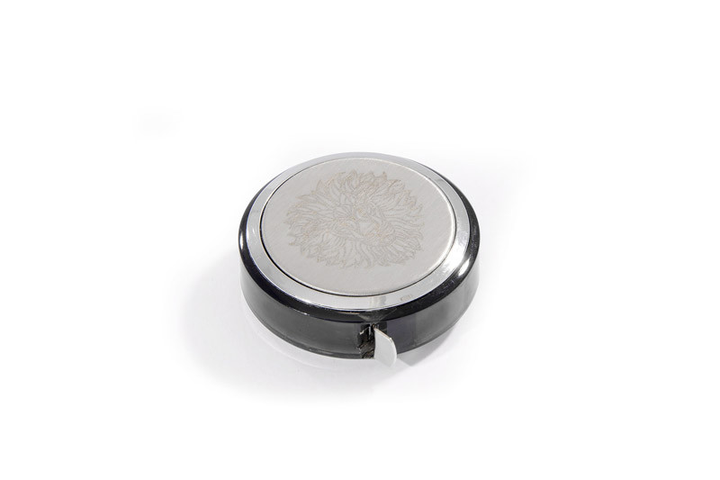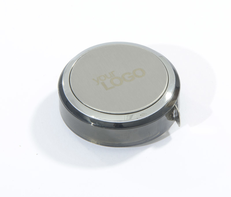 Practical tape measurer 2 m long with small size which will fit every [pocket and bag. Made from metal with transparent plastic sides. Logo will be engraved.