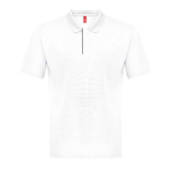 Men's short-sleeved technical polo shirt in 100% recycled polyester pique knit (180 g/m²). This polo shirt has a 1x1 rib collar and double stitching on the sleeves and bottom. Reinforced placket with 3 coloured buttons finished in black. Piece cut and sewn with small side openings at the bottom of the polo and finished in black. Sizes: S, M, L, XL, XXL, 3XL