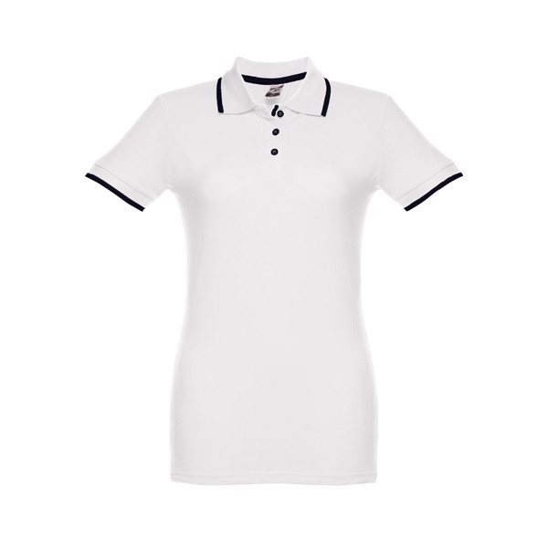 Short-sleeved bicolour polo for women in 100% carded cotton pique (210 g/m²). Two-colour contrast on the collar, sleeve and placket. Features a collar and cuffs in Rib. Reinforced placket with 3 contrasting colour buttons (extra button inserted in the inner side seam). Fitted waist and small side vents at the hemline of the polo. Sizes: S, M, L, XL, XXL