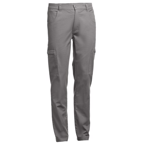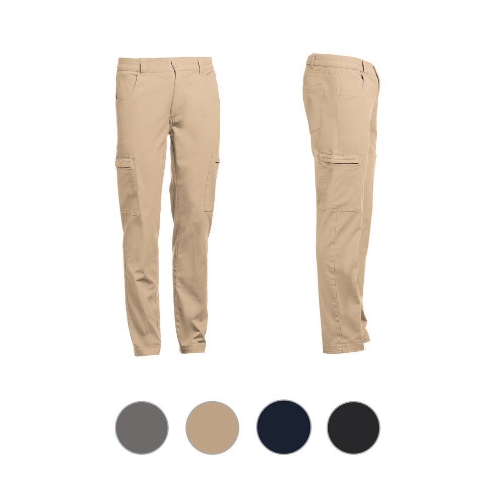 98% cotton and 2% elastane trousers (240 g/m²). Contains 6 pockets: 2 side pockets with zip closure, 2 front pockets and 2 back pockets. Waist with elastic on the sides. Sizes: S, M, L, XL, XXL, 3XL