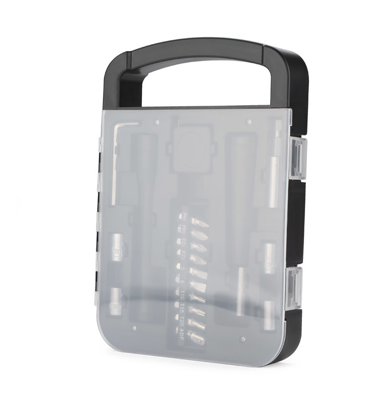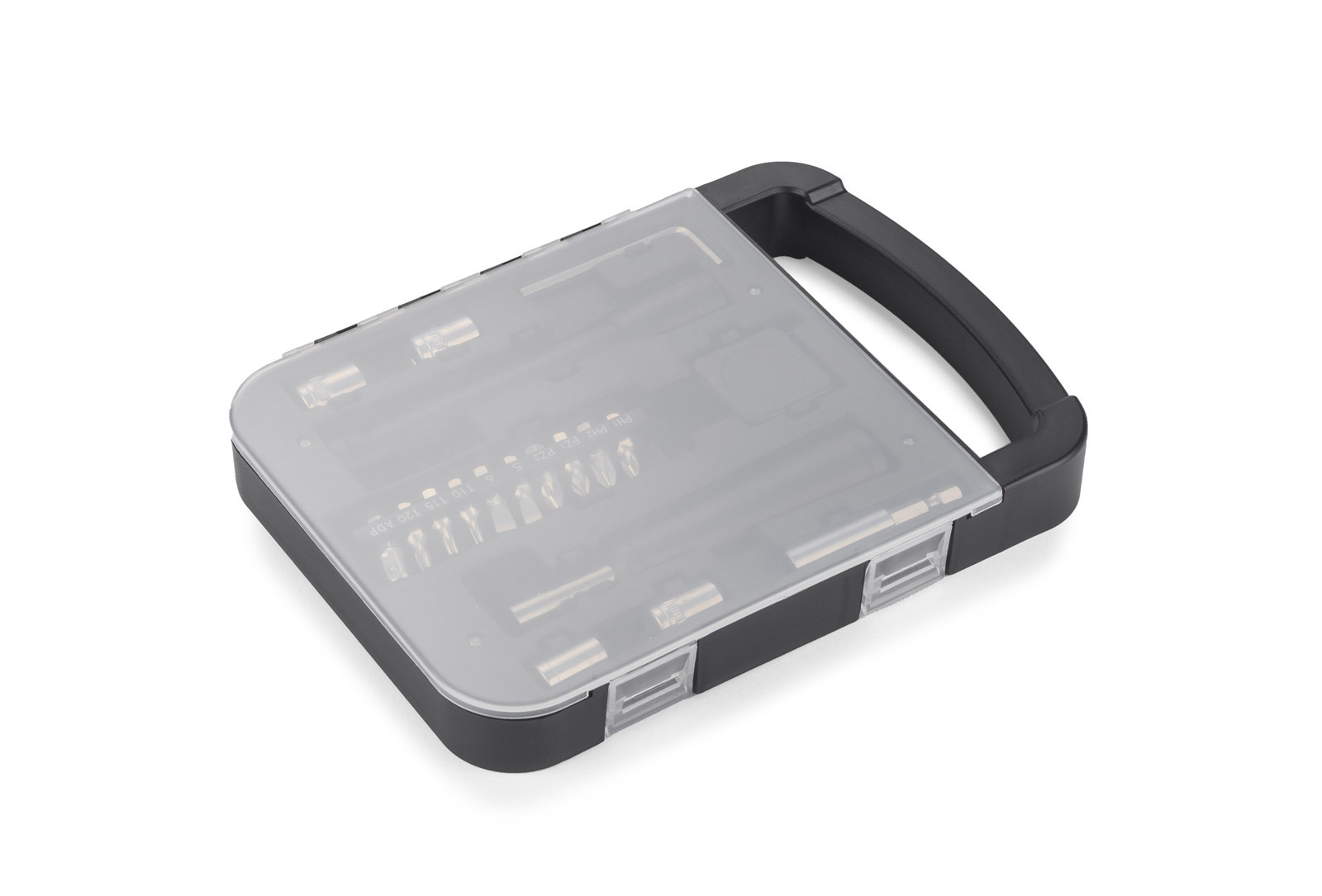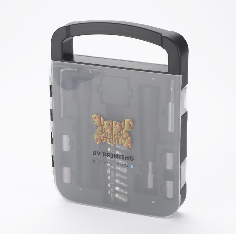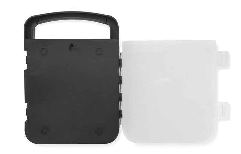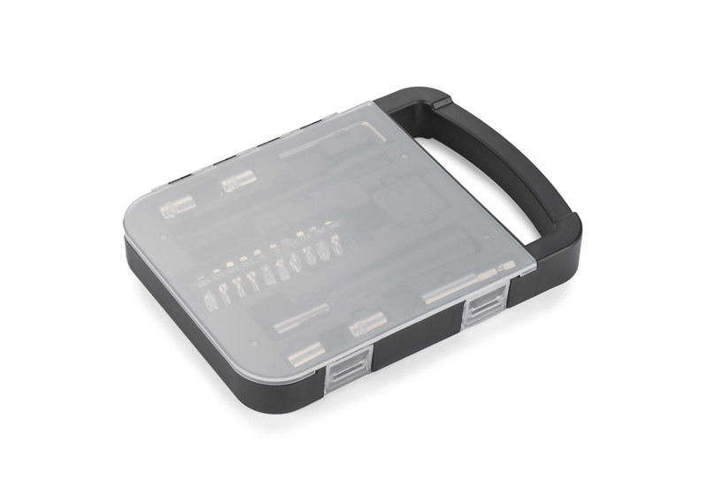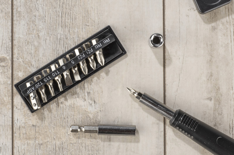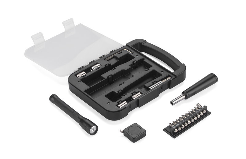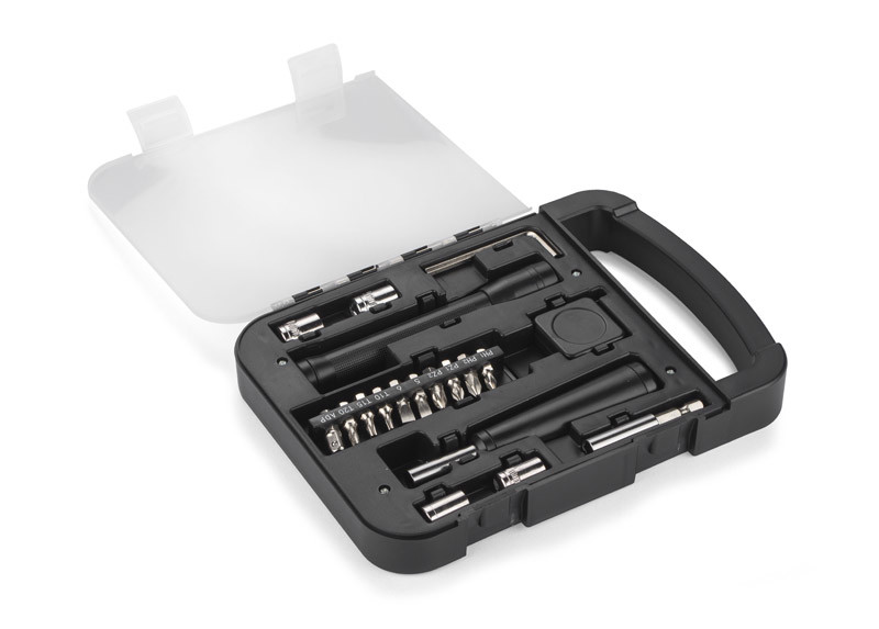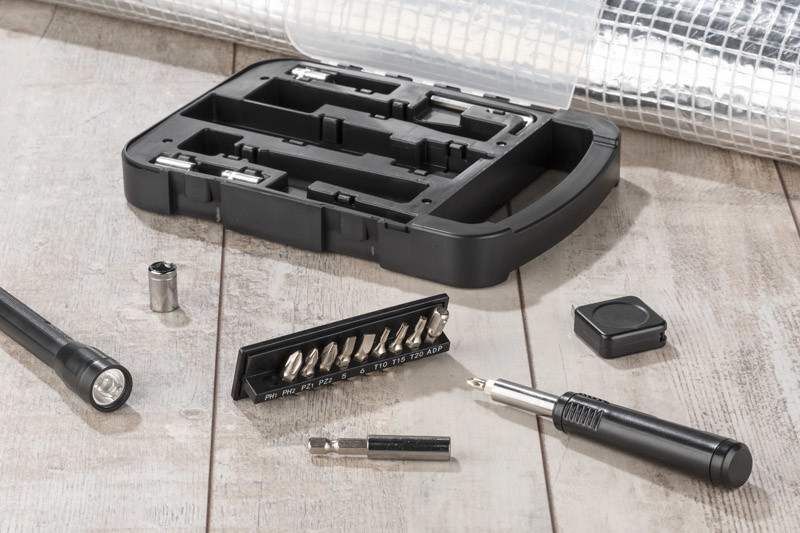 FIXO's toolkit in a practical installation. Inside there are: Allen wrench, flashlight, tape measure, screwdriver, other various bits, extension and four sockets 7mm, 8mm, 9mm and 10mm.