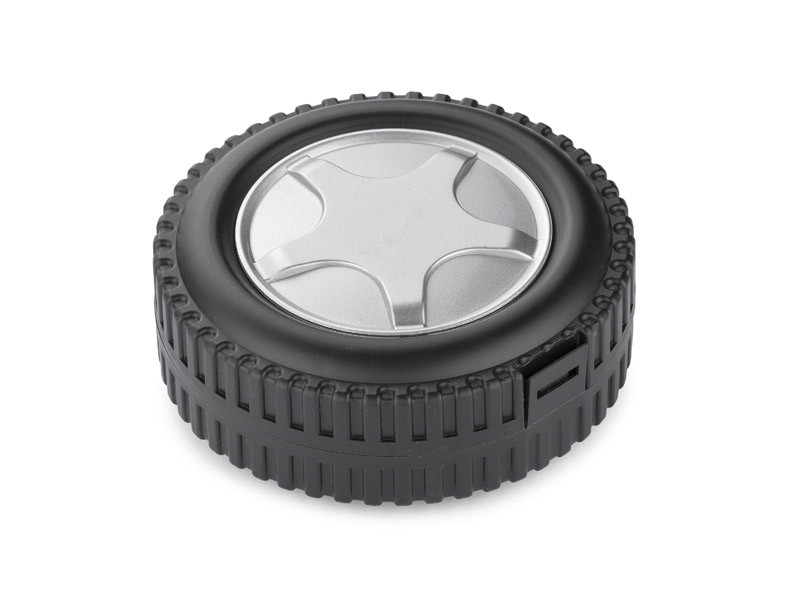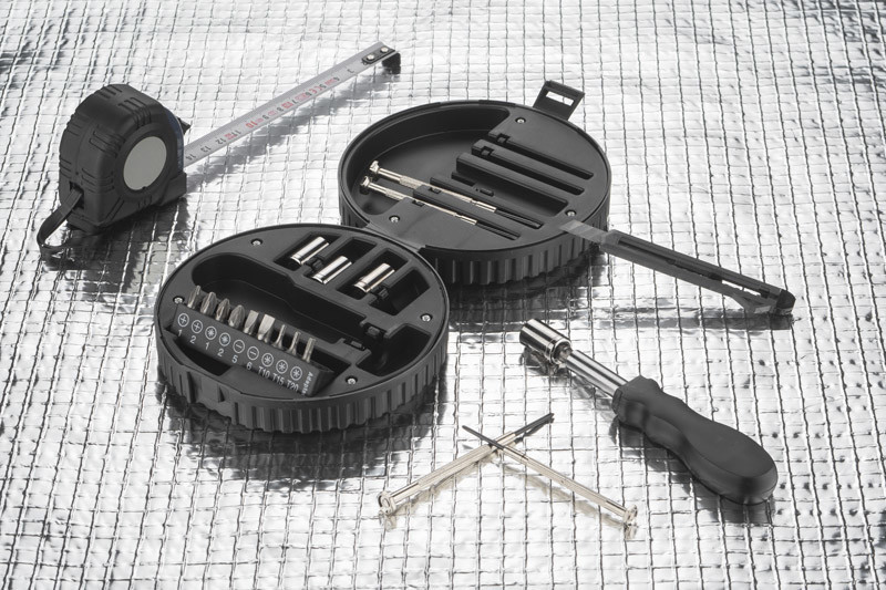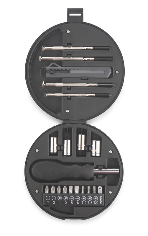 WHEEL is a set with many useful tools: four precision screwdrivers, a wallpaper knife, a handle, four socket wrenches with an adapter and nine bits. Everything is closed in a characteristic case in the shape of a car wheel.