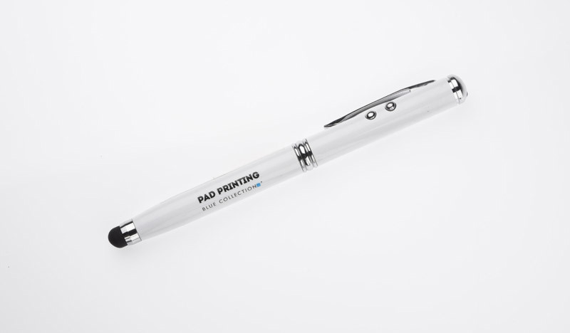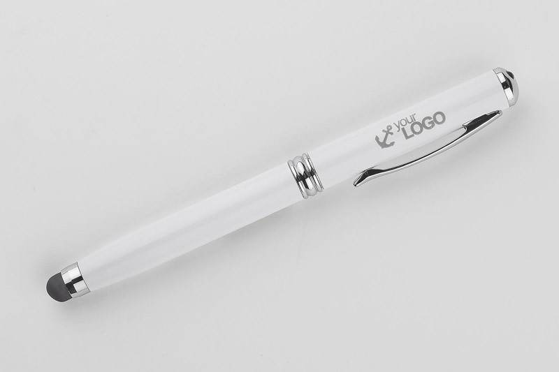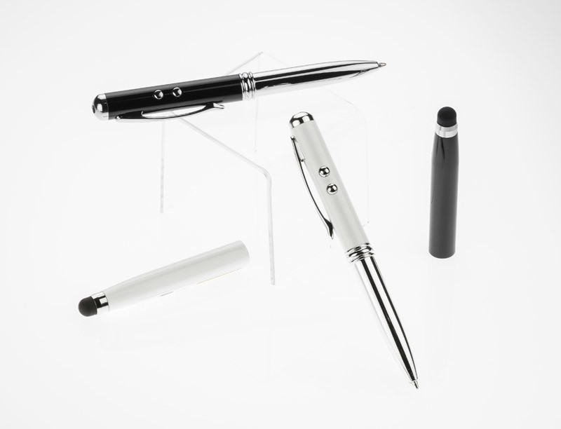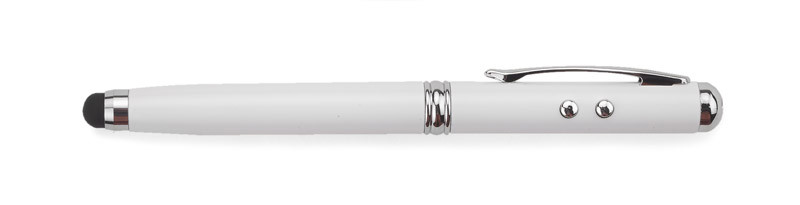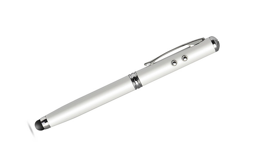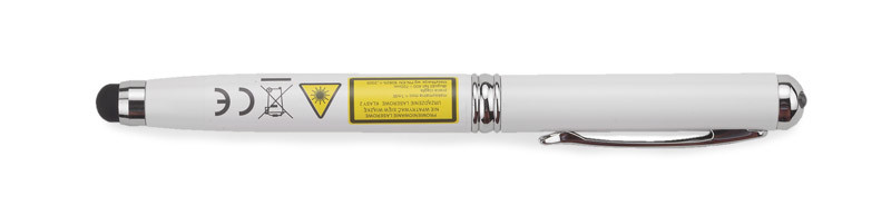 Ball pen made from metal with 4 useful functions: ball pen, touch pen, laser pointer and flash light. One thing containing everything you may need during presentations or business meetings. Logo will be engraved.According to European Union directive and Polish standard laser pointer is marked with warning label.
