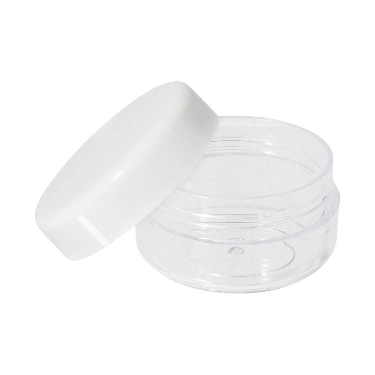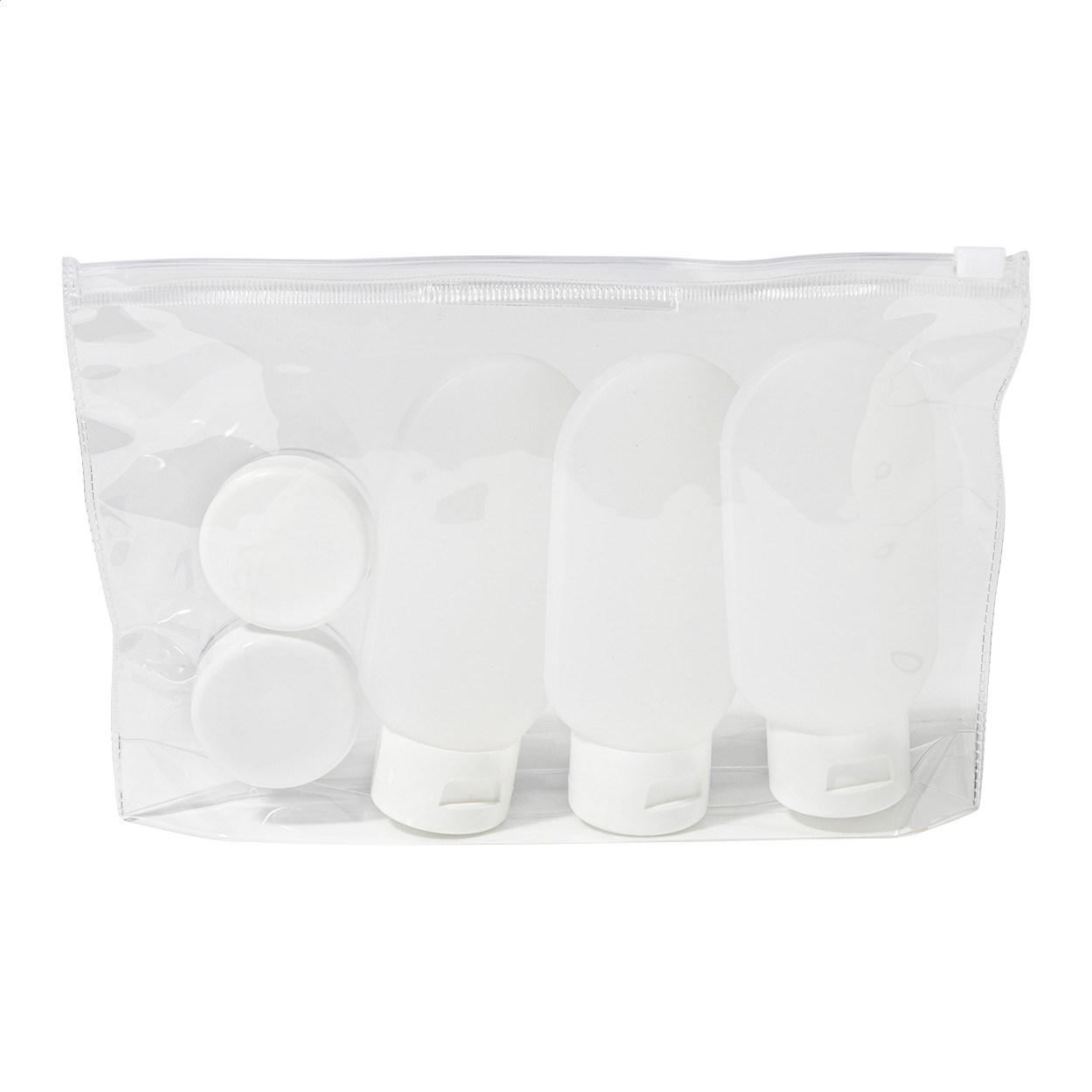 Travel cosmetic set with zipped, transparent PVC pouch and 5 refillable containers. Including 3 bottles (60 ml) and 2 jars (10 ml). Ideal for organizing toiletries for airport security checking.