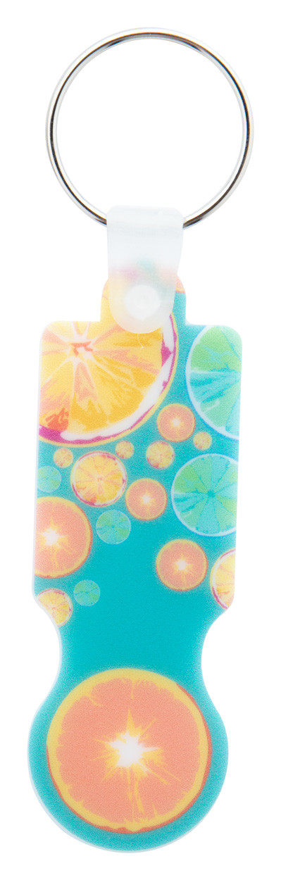 Plastic shopping trolley coin keyring with full colour graphics. Price includes UV LED printing on one side. MOQ: 200 pcs.
