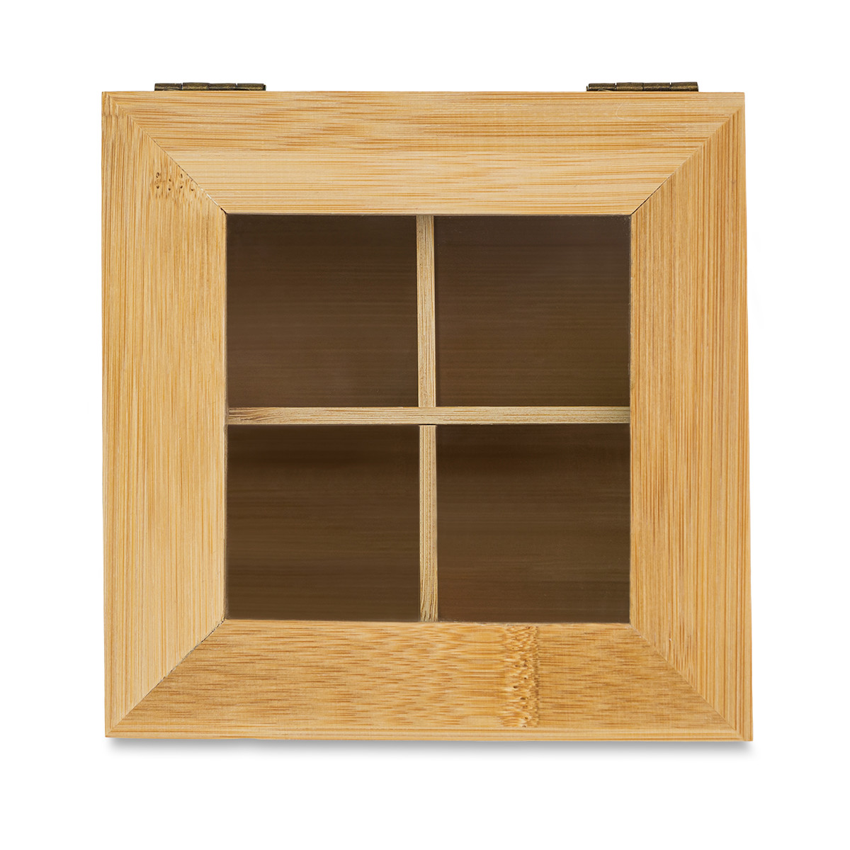Bamboo tea storage box with transparent lid and 4 compartments.