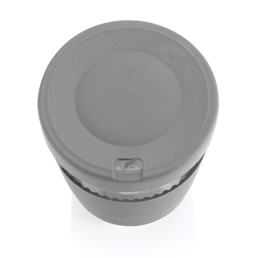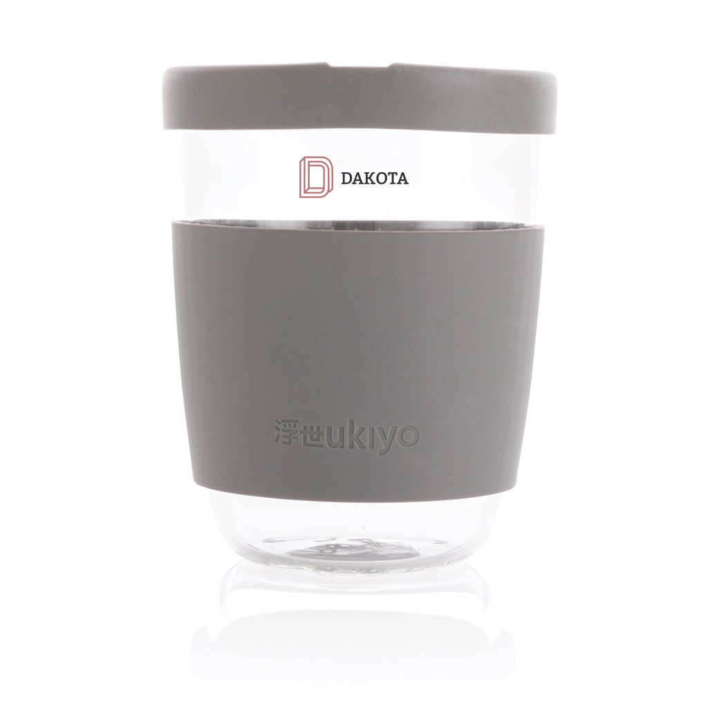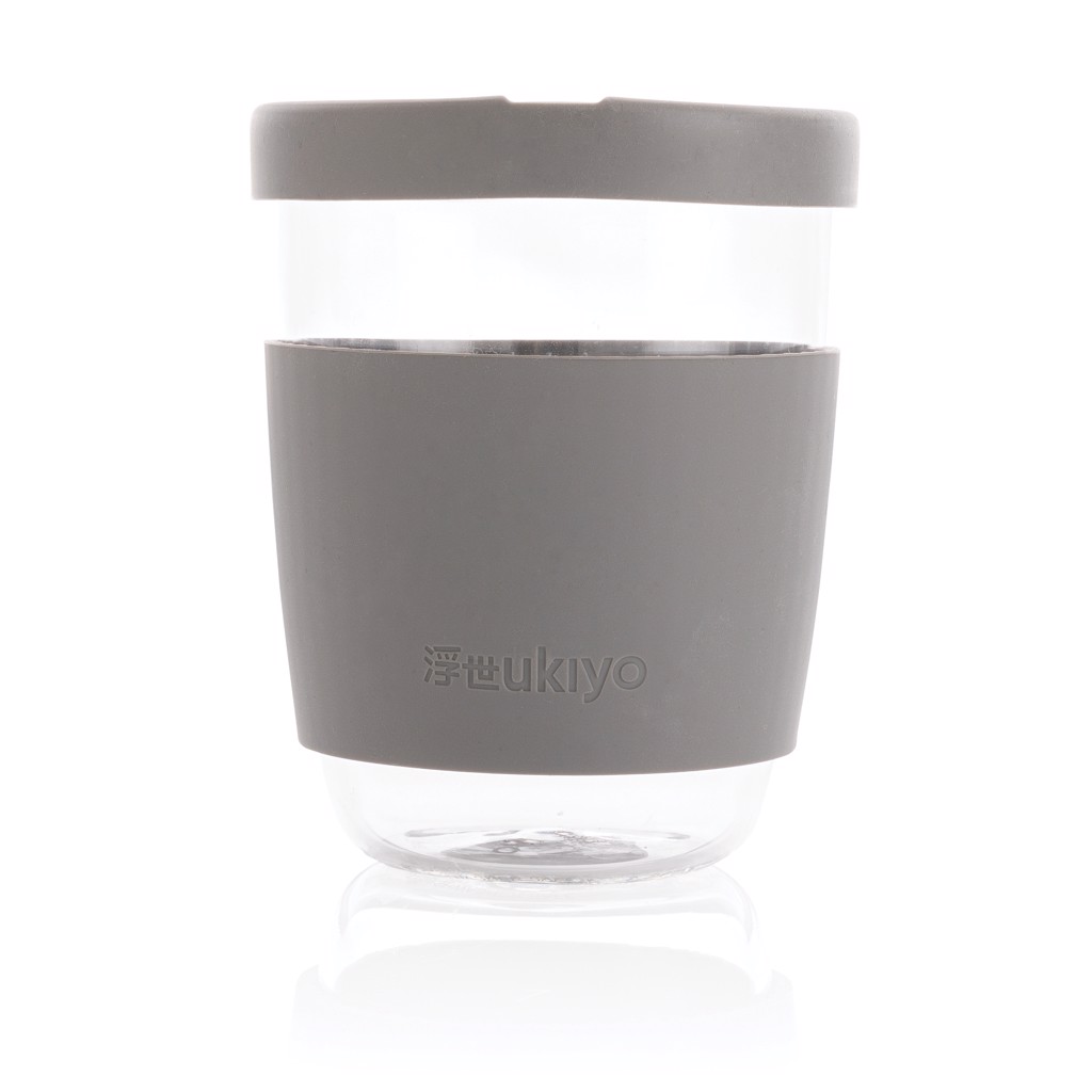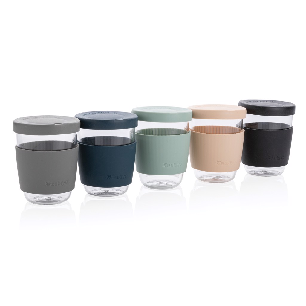 Enjoy your coffee at work or at home in this Ukiyo borosilicate glass with silicone lid and sleeve. The cup has a nice grip and a slim shape. A small vent in the lid allows steam to escape to prevent pressure build-up. BPA free. Capacity 360ml.