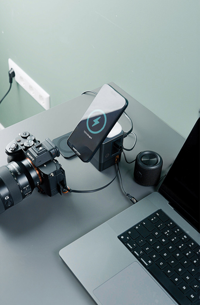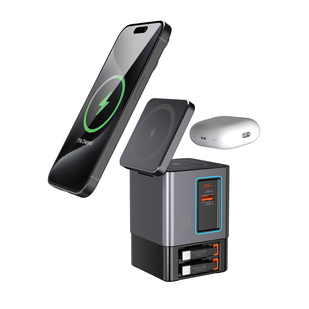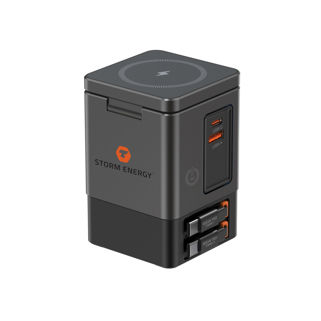 The all-in-one power solution you’ve been waiting for. Sacramento is a 105W GaN charging station that combines maximum power with built-in convenience. It features two integrated retractable 65W USB-C cables, so you always have fast charging at your fingertips — no extra cables needed. Need more options? Sacramento also includes a USB-A and USB-C port, giving you a total of four output options to charge laptops, tablets, smartphones, and more — all at once. And for your wireless devices, Sacramento is equipped with a powerful 15W magnetic wireless charger that keeps your phone securely in place, plus a separate wireless pad designed specifically for smaller items like earbuds or AirPods (5W max).Sacramento delivers high performance with a compact, efficient design — producing less heat and using energy more efficiently than traditional chargers. Sacramento is made with RCS (Recycled Claim Standard) certified recycled fireproof PC. Total recycled content: 26% based on total item weight.