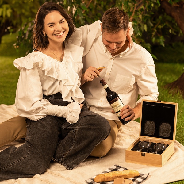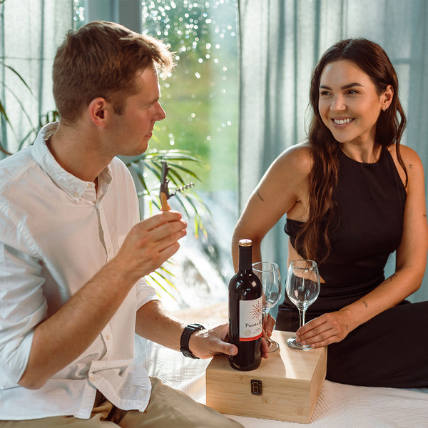 A set consisting of two elegant wine glasses (310ml) and a corkscrew, all neatly packed in a beautiful bamboo wooden box. Wine glasses are made of glass, with a delicate shape that helps to enhance the taste and aroma of the wine. It is a perfect gift for lovers of wine and elegant accessories.