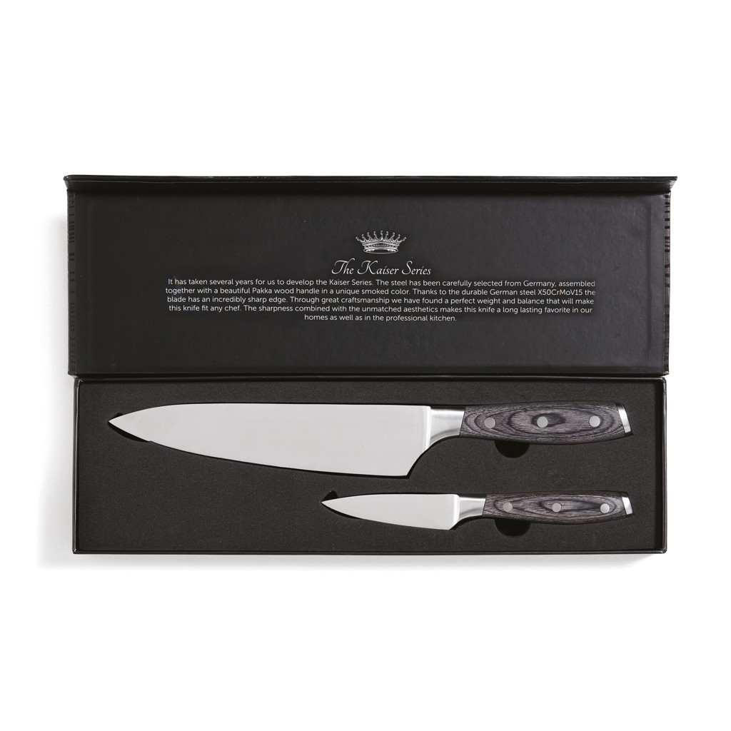 Set of one chef’s knife and one paring knife. The knives are made of X50CrMoV15 German steel with a Pakkawood handle. The easy-grip handle and superb balance in the blade makes the knife comfortable and easy to work with. Chef's knife: 20 cm blade. Paring knife: 8 cm blade.