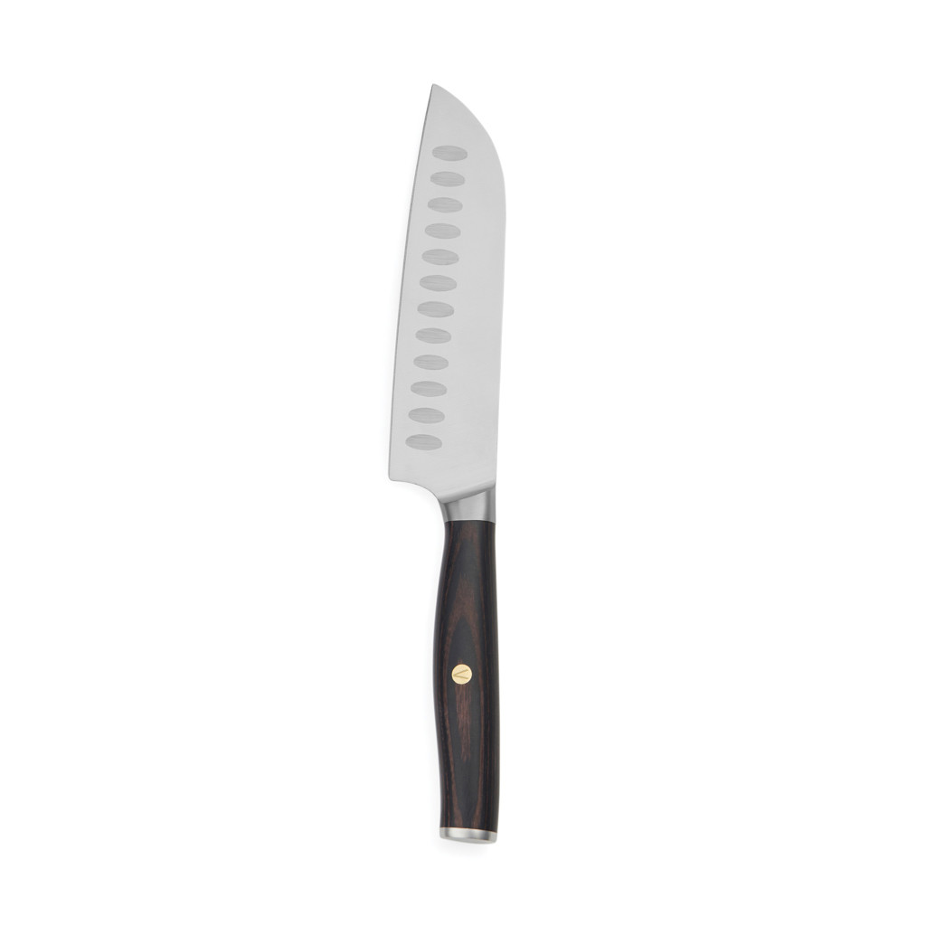 The Tara santoku knife, made from stainless steel, offers both style and versatility. The santoku knife’s blade with scalloped indentations helps to reduce food sticking to the blade, ensuing in smoother cutting and slicing. Crafted from high-quality 5Cr15Mov stainless steel, these knives boast exceptional durability and performance. The beautiful pakkawood handle provides a comfortable and secure grip, while the superb balance in the blade ensures ease of use. Size: 25.6 cm (blade 14 cm). Hand wash only to ensure a long life.